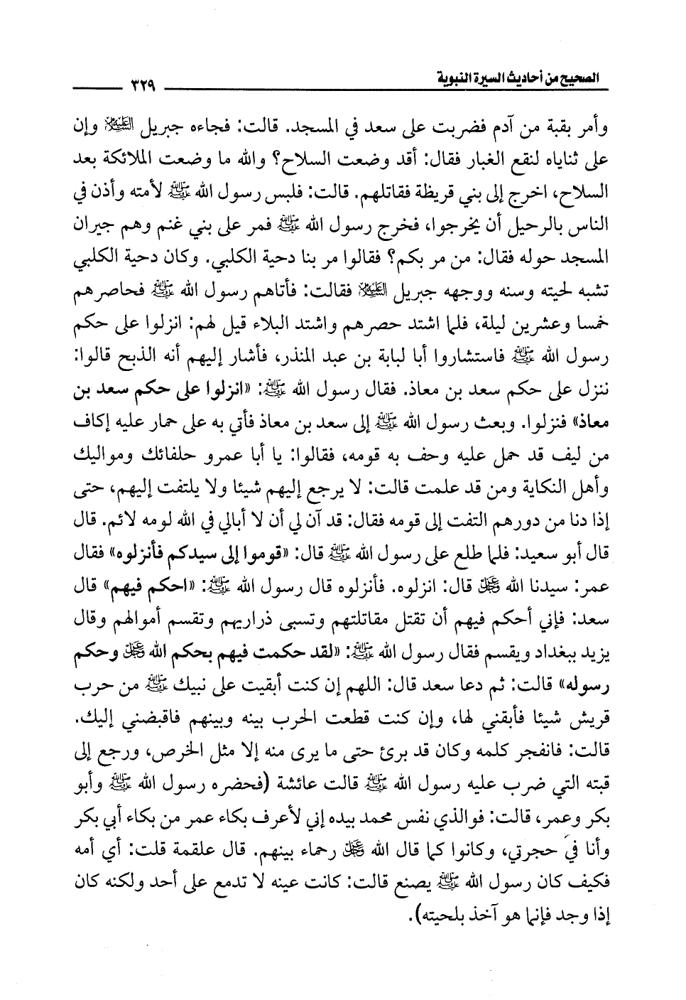 وأمر بقبة من آدم فضربت على سعد في المسجد. قالت: فجاءه جبريل -عليه السلام- وإن على ثناياه لنقع الغبار فقال: أقد وضعت السلاح؟ والله ما وضعت الملائكة بعد السلاح، أخرج إلى بني قريظة فقاتلهم. قالت: فلبس رسول الله - صلى الله عليه وسلم - لأمته وأذن في الناس بالرحيل أن يخرجوا، فخرج رسول الله - صلى الله عليه وسلم - فمر علي بني غنم وهم جيران المسجد حوله فقال: من مر بكم؟ فقالوا مر بنا دحية الكلبي. وكان دحية الكلبي تشبه لحيته وسنه ووجهه جبريل -عليه السلام- فقالت: فأتاهم رسول الله - صلى الله عليه وسلم - فحاصرهم خمسا وعشرين ليلة، فلما اشتد حصرهم واشتد البلاء قيل لهم: انزلوا على حكم رسول الله - صلى الله عليه وسلم - فاستشاروا أبا لبابة بن عبد المنذر، فأشار إليهم أنه الذبح قالوا: ننزل على حكم سعد بن معاذ. فقال رسول الله - صلى الله عليه وسلم -: "انزلوا على حكم سعد بن معاذ" فنزلوا. وبعث رسول الله - صلى الله عليه وسلم - إلى سعد بن معاذ فأتي به على حمار عليه إكاف من ليف قد حمل عليه وحف به قومه، فقالوا: يا أبا عمرو حلفائك ومواليك وأهل النكاية ومن قد علمت قالت: لا يرجع إليهم شيئًا ولا يلتفت إليهم، حتى إذا دنا من دورهم التفت إلى قومه فقال: قد آن لي أن لا أبالي في الله لومه لائم. قال قال أبو سعيد: فلما طلع على رسول الله - صلى الله عليه وسلم - قال: "قوموا إلى سيدكم فأنزلوه" فقال عمر: سيدنا الله -عَزَّ وَجَلَّ- قال: انزلوه، فأنزلوه قال رسول الله - صلى الله عليه وسلم -: "احكم فيهم" قال سعد: فإني أحكم فيهم أن تقتل مقاتلتهم وتسبى ذراريهم وتقسم أموالهم وقال يزيد ببغداد ويقسم فقال رسول الله - صلى الله عليه وسلم -: "لقد حكمت فيهم بحكم الله -عَزَّ وَجَلَّ- وحكم رسوله" قالت: ثم دعا سعد قال: اللَّهم إن كنت أبقيت على نبيك - صلى الله عليه وسلم - من حرب قريش شيئًا فأبقني لها، وإن كنت قطعت الحرب بينه وبينهم فاقبضني إليك. قالت: فانفجر كلمه وكان قد برئ حتى ما يرى منه إلا مثل الخرص، ورجع إلى قبته التي ضرب عليه رسول الله - صلى الله عليه وسلم - قالت عائشة (فحضره رسول الله - صلى الله عليه وسلم - وأبو بكر وعمر، قالت: فوالذي نفس محمَّد بيده إني لأعرف بكاء عمر من بكاء أبي بكر وأنا في حجرتي، وكانوا كما قال الله -عَزَّ وَجَلَّ- رحماء بينهم، قال علقمة قلت: أي أمه فكيف كان رسول الله - صلى الله عليه وسلم - يصنع قالت: كانت عينه لا تدمع على أحد ولكنه كان إذا وجد فإنما هو آخذ بلحيته).