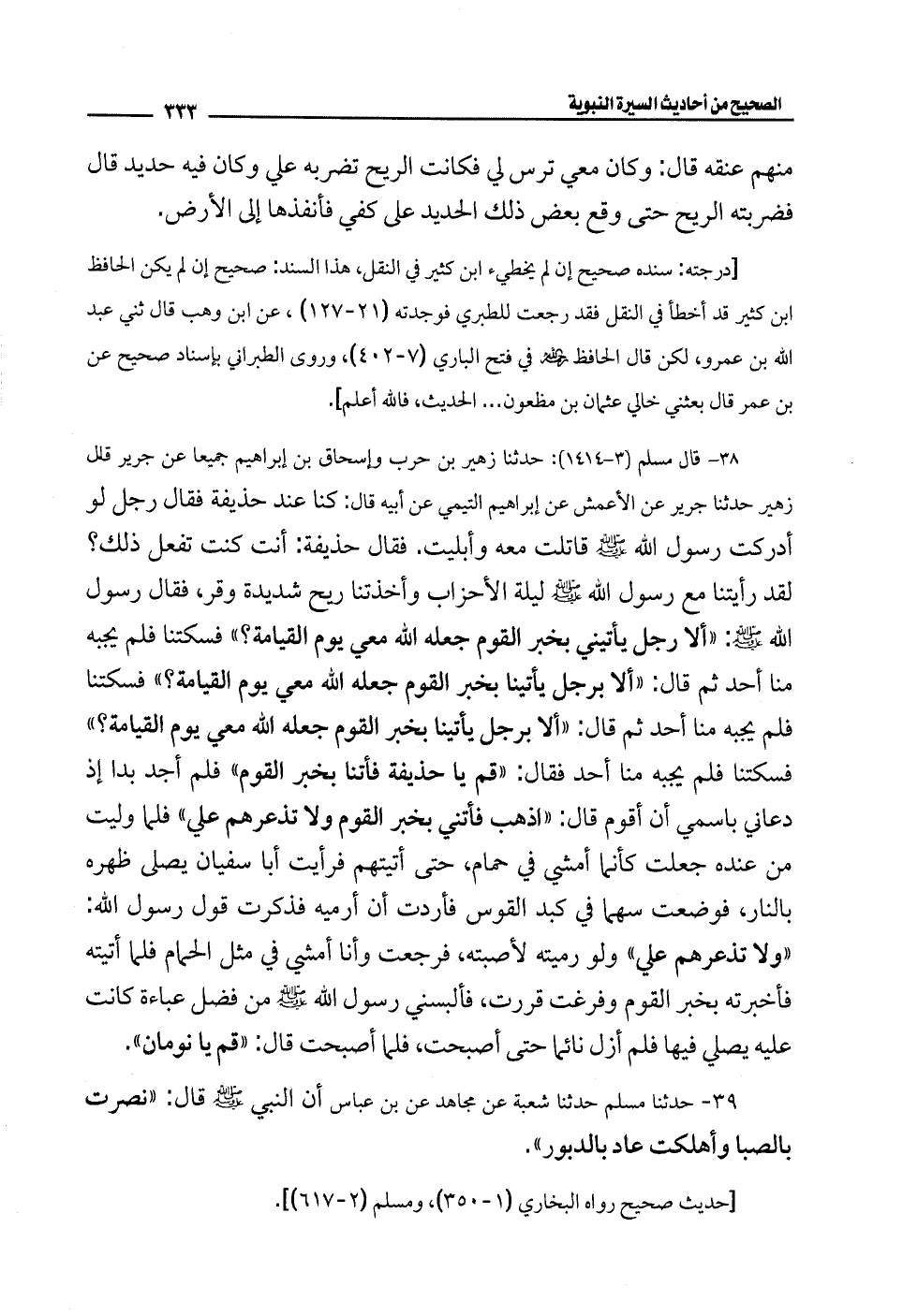 38 - قال مسلم (3 - 1414): حدثنا زهير بن حرب وإسحاق بن إبراهيم جميعا عن جرير قال زهير حدثنا جرير عن الأعمش عن إبراهيم التيمي عن أبيه قال: كنا عند حذيفة فقال رجل لو أدركت رسول الله - صلى الله عليه وسلم - قاتلت معه وأبليت. فقال حذيفة: أنت كنت تفعل ذلك؟ لقد رأيتنا مع رسول الله - صلى الله عليه وسلم - ليلة الأحزاب وأخذتنا ريح شديدة وقر، فقال رسول الله - صلى الله عليه وسلم -: "ألا رجل يأتيني بخبر القوم جعله الله معي يوم القيامة؟ " فسكتنا فلم يجبه منا أحد ثم قال: "ألا برجل يأتينا بخبر القوم جعله الله معي يوم القيامة؟ " فسكتنا فلم يجبه منا أحد ثم قال: "ألا برجل يأتينا بخبر القوم جعله الله معي يوم القيامة؟ " فسكتنا فلم يجبه منا أحد فقال: "قم يا حذيفة فأتنا بخبر القوم" فلم أجد بدًا إذ دعاني باسمي أن أقوم قال: "اذهب فأتني بخبر القوم ولا تذعرهم علي" فلما وليت من عنده جعلت كأنما أمشي في حمام، حتى أتيتهم فرأيت أبا سفيان يصلى ظهره بالنار، فوضعت سهما في كبد القوس فأردت أن أرميه فذكرت قول رسول الله: "ولا تذعرهم علي" ولو رميته لأصبته، فرجعت وأنا أمشي في مثل الحمام فلما أتيته فأخبرته بخبر القوم وفرغت قررت، فألبسني رسول الله - صلى الله عليه وسلم - من فضل عباءة كانت عليه يصلي فيها فلم أزل نائما حتى أصبحت، فلما أصبحت قال: "قم يا نومان".