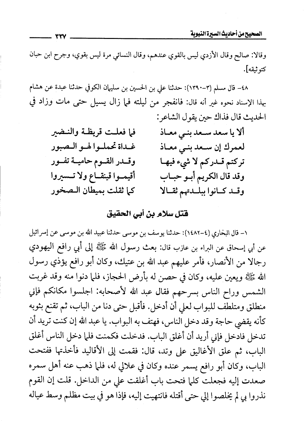 48 - قال مسلم (3 - 1390): حدثنا علي بن الحسين بن سليمان الكوفي حدثنا عبدة عن هشام بهذا الإسناد نحوه غير أنه قال: فانفجر من ليلته فما زال يسيل حتى مات وزاد في الحديث قال فذاك حين يقول الشاعر: