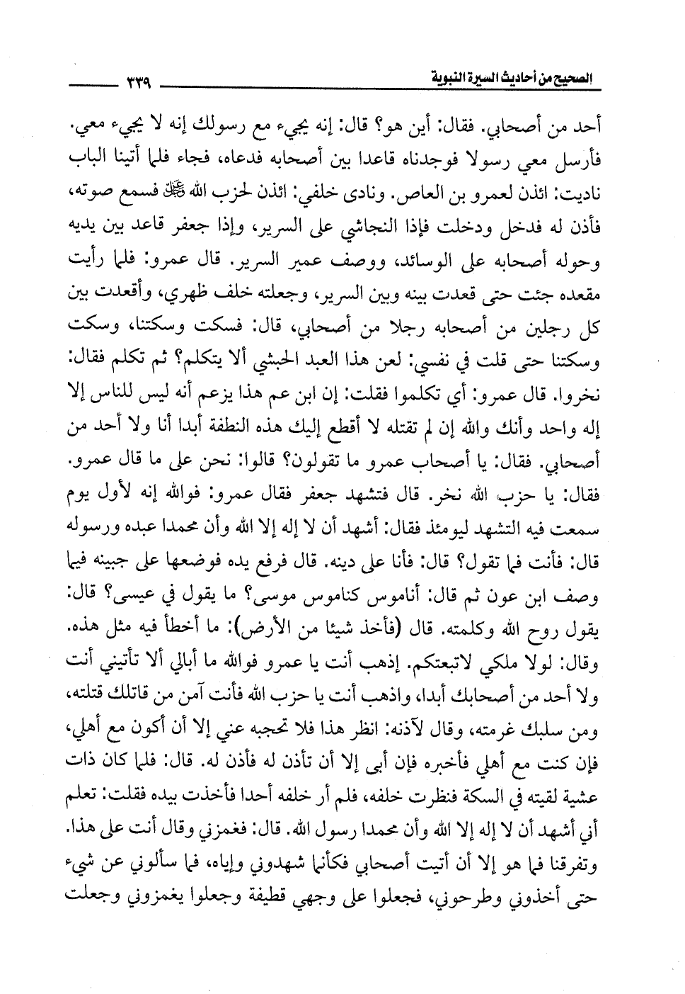 أحد من أصحابي. فقال: أين هو؟ قال: إنه يجيء مع رسولك إنه لا يجيء معي. فأرسل معي رسولا فوجدناه قاعدا بين أصحابه فدعاه، فجاء فلما أتينا الباب ناديت: ائذن لعمرو بن العاص. ونادى خلفي: ائذن لحزب الله -عَزَّ وَجَلَّ- فسمع صوته، فأذن له فدخل ودخلت فإذا النجاشي على السرير، وإذا جعفر قاعد بين يديه وحوله أصحابه على الوسائد، ووصف عمير السرير، قال عمرو: فلما رأيت مقعده جئت حتى قعدت بينه وبين السرير، وجعلته خلف ظهري، وأقعدت بين كل رجلين من أصحابه رجلا من أصحابي، قال: فسكت وسكتنا، وسكت وسكتنا حتى قلت في نفسي: لعن هذا العبد الحبشي ألا يتكلم؟ ثم تكلم فقال: نخروا. قال عمرو: أي تكلموا فقلت: إن ابن عم هذا يزعم أنه ليس للناس إلا إله واحد وأنك والله إن لم تقتله لا أقطع إليك هذه النطفة أبدا أنا ولا أحد من أصحابي. فقال: يا أصحاب عمرو ما تقولون؟ قالوا: نحن على ما قال عمرو. فقال: يا حزب الله نخر. قال فتشهد جعفر فقال عمرو: فوالله إنه لأول يوم سمعت فيه التشهد ليومئذ فقال: أشهد أن لا إله إلا الله وأن محمدا عبده ورسوله قال: فأنت فما تقول؟ قال: فأنا على دينه. قال فرفع يده فوضعها على جبينه فيما وصف ابن عون ثم قال: أناموس كناموس موسى؟ ما يقول في عيسى؟ قال: يقول روح الله وكلمته، قال (فأخذ شيئًا من الأرض): ما أخطأ فيه مثل هذه. وقال: لولا ملكي لاتبعتكم. إذهب أنت يا عمرو فوالله ما أبالي ألا تأتيني أنت ولا أحد من أصحابك أبدا، واذهب أنت يا حزب الله فأنت آمن من قاتلك قتلته، ومن سلبك غرمته، وقال لآذنه: انظر هذا فلا تحجبه عني إلا أن أكون مع أهلي، فإن كنت مع أهلي فأخبره فإن أبى إلا أن تأذن له فأذن له. قال: فلما كان ذات عشية لقيته في السكة فنظرت خلفه، فلم أر خلفه أحدا فأخذت بيده فقلت: تعلم أني أشهد أن لا إله إلا الله وأن محمدا رسول الله. قال: فغمزني وقال أنت على هذا. وتفرقنا فما هو إلا أن أتيت أصحابي فكأنما شهدوني وإياه، فما سألوني عن شيء حتى أخذوني وطرحوني، فجعلوا على وجهي قطيفة وجعلوا يغمزوني وجعلت