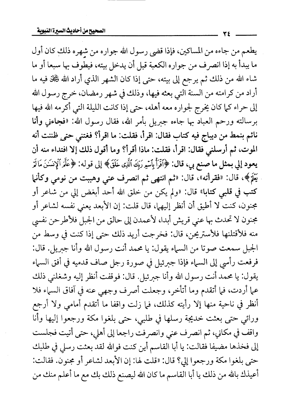 يطعم من جاءه من المساكين، فإذا قضى رسول الله جواره من شهره ذلك كان أول ما يبدأ به إذا انصرف من جواره الكعبة قبل أن يدخل بيته، فيطوف بها سبعًا أو ما شاء الله من ذلك ثم يرجع إلى بيته، حتى إذا كان الشهر الذي أراد الله -عَزَّ وَجَلَّ- فيه ما أراد من كرامته من السنة التي بعثه فيها، وذلك في شهر رمضان، خرج رسول الله إلى حراء كلما كان يخرج لجواره معه أهله، حتى إذا كانت الليلة التي أكرمه الله فيها برسالته ورحم العباد بها جاءه جبريل بأمر الله، فقال رسول الله: "فجاءني وأنا نائم بنمط من ديباج فيه كتاب فقال: اقرأ، فقلت: ما اقرأ؟ فغتني حتى ظننت أنه الموت، ثم أرسلني فقال: اقرأ، فقلت: ماذا أقرأ؟ وما أقول ذلك إلا افتداء منه أن يعود إلي بمثل ما صنع بي، قال: {اقْرَأْ بِاسْمِ رَبِّكَ الَّذِي خَلَقَ} إلى قوله: {عَلَّمَ الْإِنْسَانَ مَا لَمْ يَعْلَمْ}، قال: "فقرأته"، قال: "ثم انتهى ثم انصرف عني وهببت من نومي وكأنما كتب في قلبي كتابا" قال: "ولم يكن من خلق الله أحد أبغض إلي من شاعر أو مجنون، كنت لا أطيق أن أنظر إليهما، قال قلت: إن الأبعد يعني نفسه لشاعر أو مجنون لا تحدث بها عني قريش أبدًا، لأعمدن إلى حالق من الجبل فلأطرحن نفسي منه فلأقتلنها فلأستريحن، قال: فخرجت أريد ذلك حتى إذا كنت في وسط من الجبل سمعت صوتًا من السماء يقول: يا محمَّد أنت رسول الله وأنا جبريل. قال: فرفعت رأسي إلى السماء فإذا جبرئيل في صورة رجل صاف قدميه في أفق السماء يقول: يا محمَّد أنت رسول الله وأنا جبرئيل. قال: فوقفت انظر إليه وشغلني ذلك عما أردت، فما أتقدم وما أتأخر، وجعلت أصرف وجهي عنه في آفاق السماء فلا أنظر في ناحية منها إلا رأيته كذلك، فما زلت واقفا ما أتقدم أمامي ولا أرجع ورائي حتى بعثت خديجة رسلها في طلبي، حتى بلغوا مكة ورجعوا إليها وأنا واقف في مكاني، ثم انصرف عني وانصرفت راجعًا إلى أهلي، حتى أتيت فجلست إلى فخذها مضيفا فقالت: يا أبا القاسم أين كنت فوالله لقد بعثت رسلي في طلبك حتى بلغوا مكة ورجعوا إلى؟ قال: "قلت لها: إن الأبعد لشاعر أو مجنون. فقالت: أعيذك بالله من ذلك يا أبا القاسم ما كان الله ليصنع ذلك بك مع ما أعلم منك من