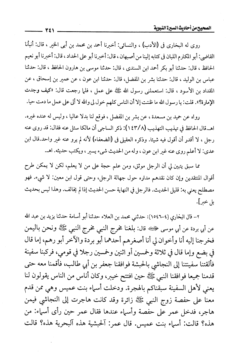2 - قال البخاري (4 - 1546): حدثني محمَّد بن العلاء حدثنا أبو أسامة حدثنا يزيد بن عبد الله عن أبي بردة عن أبي موسى -رضي الله عنه- قال: بلغنا مخرج النبي - صلى الله عليه وسلم - ونحن باليمن فخرجنا إليه أنا وأخوان لي أنا أصغرهم أحدهما أبو بردة والآخر أبو رهم، إما قال في بضع وإما قال في ثلاثة وخمسين أو اثنين وخمسن رجلًا في قومي، فركبنا سفينة فألقتنا سفينتنا إلى النجاشي بالحبشة فوافقنا جعفر بن أبي طالب، فأقمنا معه حتى قدمنا جميعًا فوافقنا النبي - صلى الله عليه وسلم - حين افتتح خيبر، وكان أناس من الناس يقولون لنا يعني لأهل السفينة سبقناكم بالهجرة. ودخلت أسماء بنت عميس وهي ممّن قدم معنا على حفصة زوج النبي - صلى الله عليه وسلم - زائرة وقد كانت هاجرت إلى النجاشي فيمن هاجر، فدخل عمر على حفصة وأسماء عندها فقال عمر حين رأى أسماء: من هذه؟ قالت: أسماء بنت عميس. قال عمر: آلحبشية هذه آلبحرية هذه؟ قالت