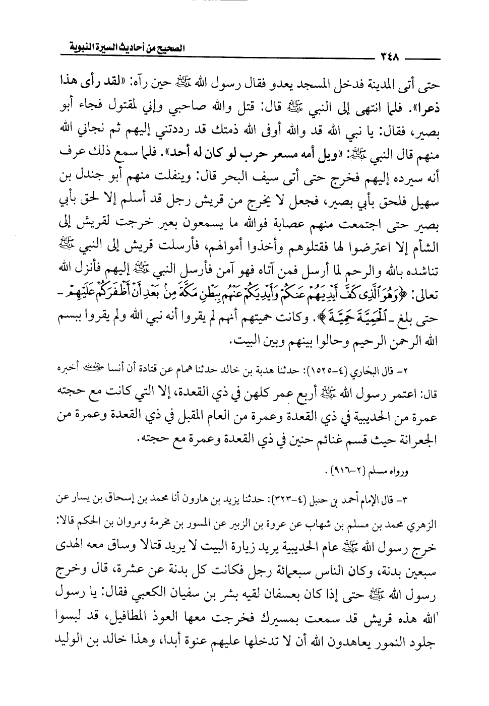 2 - قال البخاري (4 - 1525): حدثنا هدبة بن خالد حدثنا همام عن قتادة أن أنسا -رضي الله عنه- أخبره قال: اعتمر رسول الله - صلى الله عليه وسلم - أربع عمر كلهن في ذي القعدة، إلا التي كانت مع حجته عمرة من الحديبية في ذي القعدة وعمرة من العام المقبل في ذي القعدة وعمرة من الجعرانة حيث قسم غنائم حنين في ذي القعدة وعمرة مع حجته.