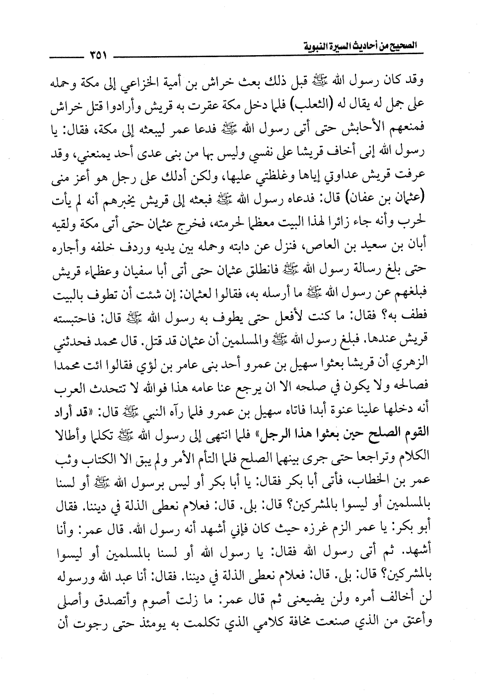 وقد كان رسول الله - صلى الله عليه وسلم - قبل ذلك بعث خراش بن أمية الخزاعي إلى مكة وحمله على جمل له يقال له (الثعلب) فلما دخل مكة عقرت به قريش وأرادوا قتل خراش فمنعهم الأحابش حتى أتى رسول الله - صلى الله عليه وسلم - فدعا عمر ليبعثه إلى مكة، فقال: يا رسول الله إنى أخاف قريشا على نفسي وليس بها من بني عدى أحد يمنعني، وقد عرفت قريش عداوتي إياها وغلظتي عليها، ولكن أدلك على رجل هو أعز مني (عثمان بن عفان) قال: فدعاه رسول الله - صلى الله عليه وسلم - فبعثه إلى قريش يخبرهم أنه لم يأت لحرب وأنه جاء زائرا لهذا البيت معظما لحرمته، فخرج عثمان حتى أتى مكة ولقيه أبان بن سعيد بن العاص، فنزل عن دابته وحمله بين يديه وردف خلفه وأجاره حتى بلغ رسالة رسول الله - صلى الله عليه وسلم - فانطلق عثمان حتى أتى أبا سفيان وعظماء قريش فبلغهم عن رسول الله - صلى الله عليه وسلم - ما أرسله به، فقالوا لعثمان: إن شئت أن تطوف بالبيت فطف به؟ فقال: ما كنت لأفعل حتى يطوف به رسول الله - صلى الله عليه وسلم - قال: فاحتبسته قريش عندها. فبلغ رسول الله - صلى الله عليه وسلم - والمسلمين أن عثمان قد قتل. قال محمَّد فحدثني الزهري أن قريشا بعثوا سهيل بن عمرو أحد بنى عامر بن لؤي فقالوا ائت محمدا فصالحه ولا يكون في صلحه إلا أن يرجع عنا عامه هذا فوالله لا تتحدث العرب أنه دخلها علينا عنوة أبدا فأتاه سهيل بن عمرو فلما رآه النبي - صلى الله عليه وسلم - قال: "قد أراد القوم الصلح حين بعثوا هذا الرجل" فلما انتهى إلى رسول الله - صلى الله عليه وسلم - تكلما وأطالا الكلام وتراجعا حتى جرى بينهما الصلح فلما التأم الأمر ولم يبق إلا الكتاب وثب عمر بن الخطاب، فأتى أبا بكر فقال: يا أبا بكر أوليس برسول الله - صلى الله عليه وسلم - أولسنا بالمسلمين أوليسوا بالمشركن؟ قال: بلى. قال. فعلام نعطى الذلة في ديننا، فقال أبو بكر: يا عمر الزم غرزه حيث كان فإني أشهد أنه رسول الله. قال عمر: وأنا أشهد. ثم أتى رسول الله فقال: يا رسول الله أولسنا بالمسلمين أوليسوا بالمشركين؟ قال: بلى. قال: فعلام نعطى الذلة في ديننا، فقال: أنا عبد الله ورسوله لن أخالف أمره ولن يضيعنى ثم قال عمر: ما زلت أصوم وأتصدق وأصلى وأعتق من الذي صنعت مخافة كلامي الذي تكلمت به يومئذ حتى رجوت أن