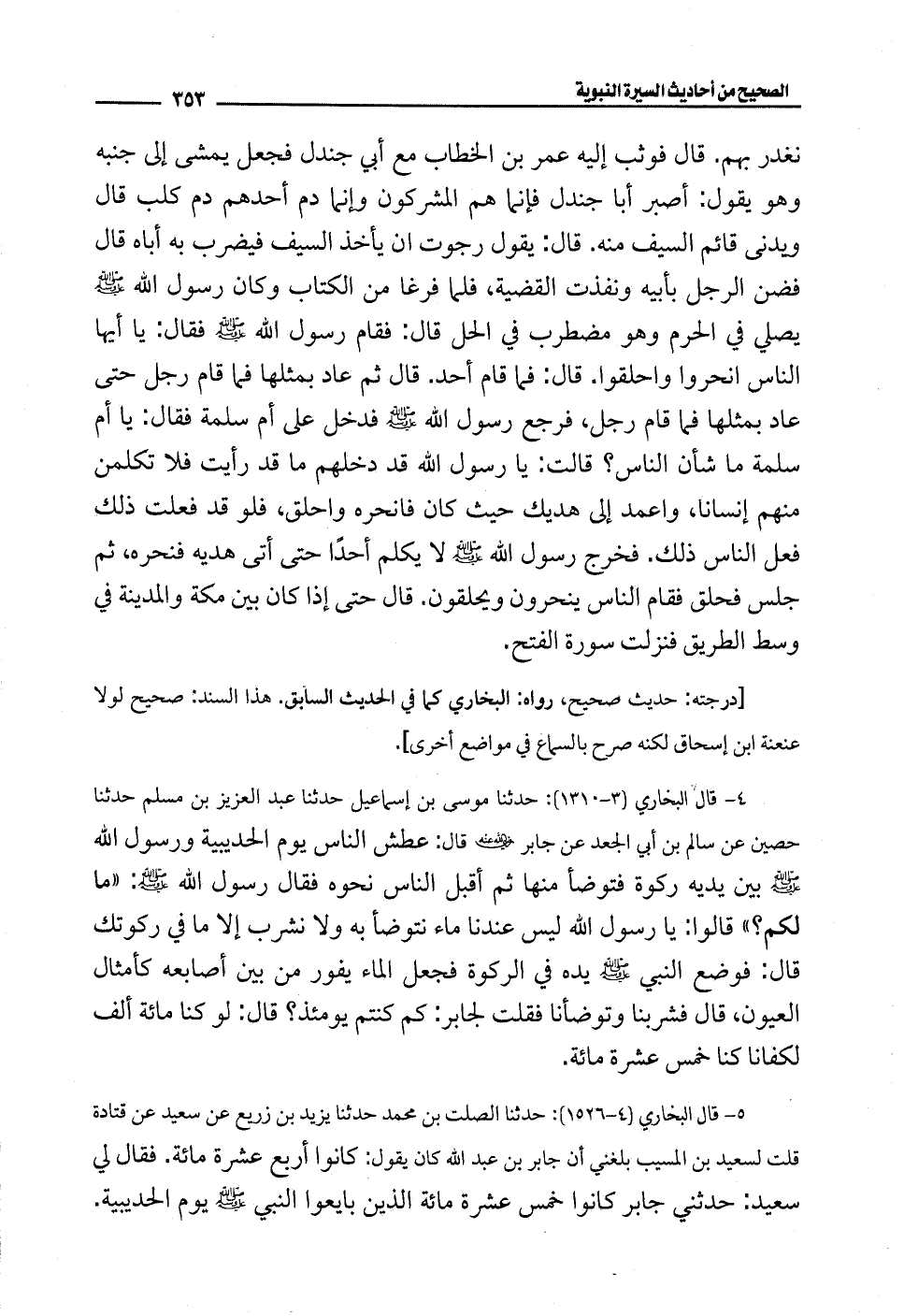 5 - قال البخاري (4 - 1526): حدثنا الصلت بن محمَّد حدثنا يزيد بن زريع عن سعيد عن قتادة قلت لسعيد بن المسيب بلغني أن جابر بن عبد الله كان يقول: كانوا أربع عشرة مائة. فقال لي سعيد: حدثني جابر كانوا خمس عشرة مائة الذين بايعوا النبي - صلى الله عليه وسلم - يوم الحديبية.