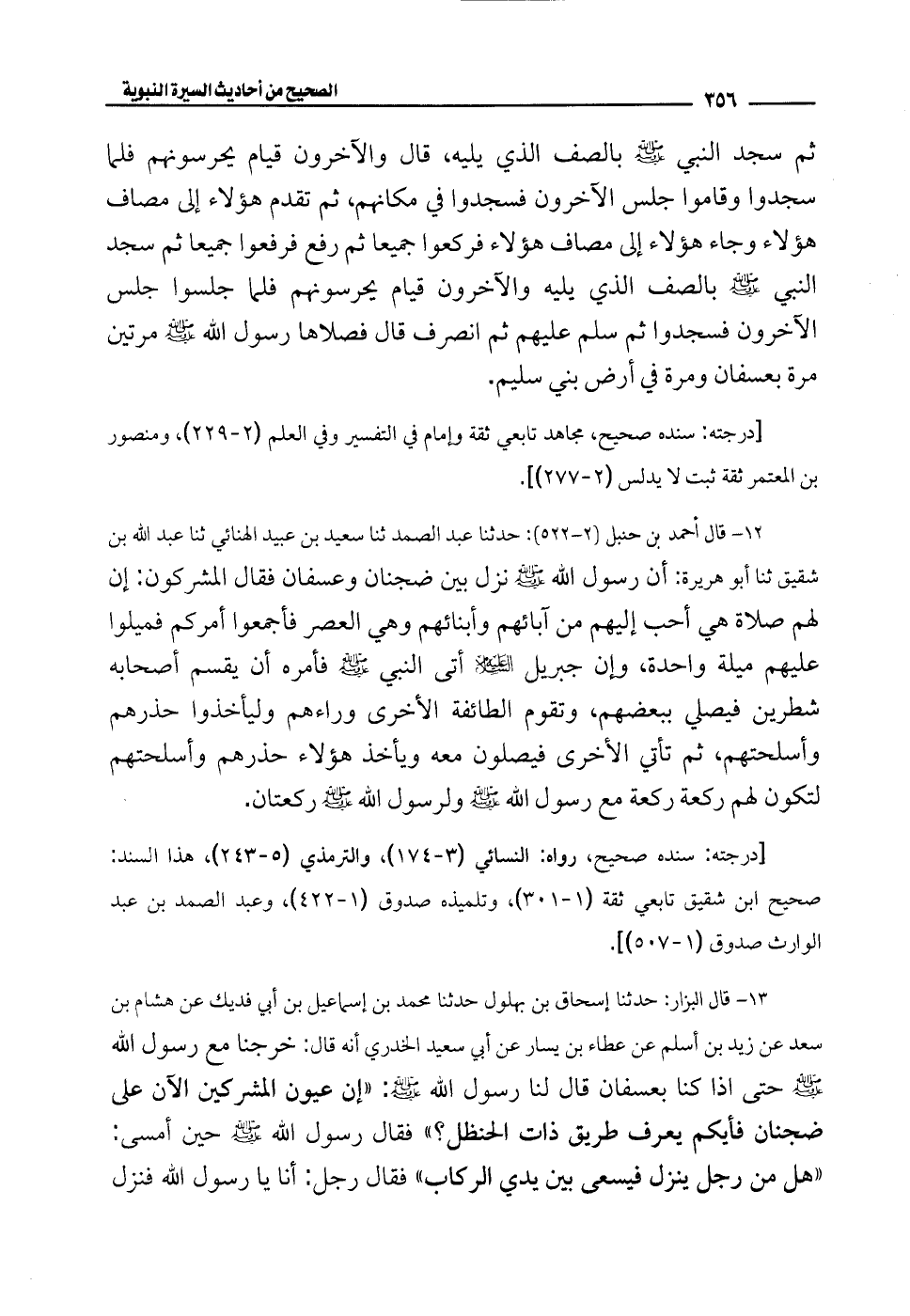 12 - قال أحمد بن حنبل (2 - 522): حدثنا عبد الصمد ثنا سعيد بن عبيد الهنائي ثنا عبد الله بن شقيق ثنا أبو هريرة: أن رسول الله - صلى الله عليه وسلم - نزل بين ضجنان وعسفان فقال المشركون: إن لهم صلاة هي أحب إليهم من آبائهم وأبنائهم وهي العصر فأجمعوا أمركم فميلوا عليهم ميلة واحدة، وإن جبريل -عليه السلام- أتى النبي - صلى الله عليه وسلم - فأمره أن يقسم أصحابه شطرين فيصلي ببعضهم، وتقوم الطائفة الأخرى وراءهم وليأخذوا حذرهم وأسلحتهم، ثم تأتي الأخرى فيصلون معه ويأخذ هؤلاء حذرهم وأسلحتهم لتكون لهم ركعة ركعة مع رسول الله - صلى الله عليه وسلم - ولرسول الله محمد - صلى الله عليه وسلم - ركعتان.