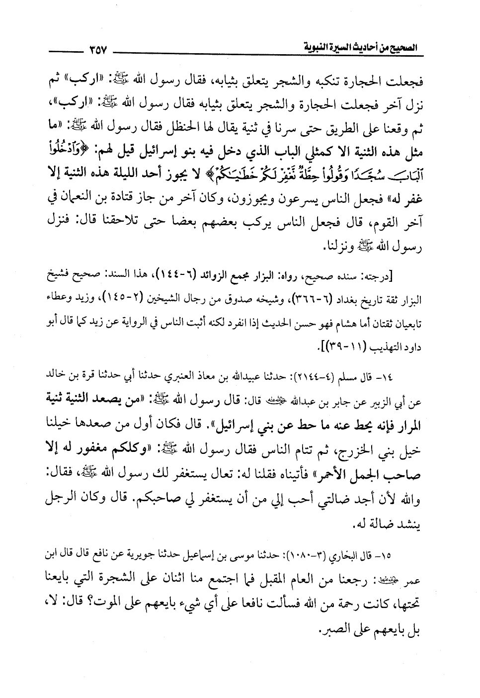 14 - قال مسلم (4 - 2144): حدثنا عبيد الله بن معاذ العنبري حدثنا أبي حدثنا قرة بن خالد عن أبي الزبير عن جابر بن عبد الله -رضي الله عنه- قال: قال رسول الله - صلى الله عليه وسلم -: "من يصعد الثنية ثنية المرار فإنه يحط عنه ما حط عن بني إسرائيل". قال فكان أول من صعدها خيلنا خيل بني الخزرج، ثم تتام الناس فقال رسول الله - صلى الله عليه وسلم -: "وكلكم مغفور له إلا صاحب الجمل الأحمر" فأتيناه فقلنا له: تعال يستغفر لك رسول الله - صلى الله عليه وسلم -، فقال: والله لأن أجد ضالتي أحب إلى من أن يستغفر لي صاحبكم. قال وكان الرجل ينشد ضالة له.