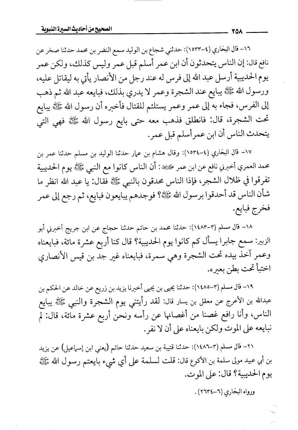 16 - قال البخاري (4 - 1533): حدثني شجاع بن الوليد سمع النفر بن محمَّد حدثنا صخر عن نافع قال: إن الناس يتحدثون أن ابن عمر أسلم قبل عمر وليس كذلك، ولكن عمر يوم الحديبية أرسل عبد الله إلى فرس له عند رجل من الأنصار يأتي به ليقاتل عليه، ورسول الله - صلى الله عليه وسلم - يبايع عند الشجرة وعمر لا يدري بذلك، فبايعه عبد الله ثم ذهب إلى الفرس، فجاء به إلى عمر وعمر يستلئم للقتال فأخبره أن رسول الله - صلى الله عليه وسلم - يبايع تحت الشجرة، قال: فانطلق فذهب معه حتى بايع رسول الله محمد - صلى الله عليه وسلم - فهي التي يتحدث الناس أن ابن عمر أسلم قبل عمر.