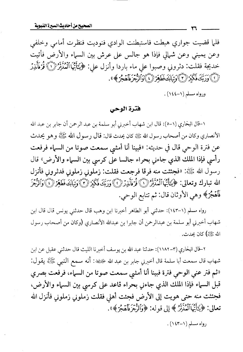 1 - قال البخاري (1 - 5): قال ابن شهاب أخبرني أبو سلمة بن عبد الرحمن أن جابر بن عبد الله الأنصاري وكان من أصحاب رسول الله - صلى الله عليه وسلم - كان يحدث قال: قال رسول الله - صلى الله عليه وسلم - وهو يحدث عن فترة الوحي قال في حديثه: "فبينا أنا أمشي سمعت صوتًا من السماء فرفعت رأسي فإذا الملك الذي جاءني بحراء جالسًا على كرسي بين السماء والأرض" قال رسول الله - صلى الله عليه وسلم -: "فجثثت منه فرقًا فرجعت فقلت: زملوني زملوني فدثروني فأنزل الله تبارك وتعالى: {يَا أَيُّهَا الْمُدَّثِّرُ (1) قُمْ فَأَنْذِرْ (2) وَرَبَّكَ فَكَبِّرْ (3) وَثِيَابَكَ فَطَهِّرْ (4) وَالرُّجْزَ فَاهْجُرْ} وهي الأوثان قال: ثم تتابع الوحي.