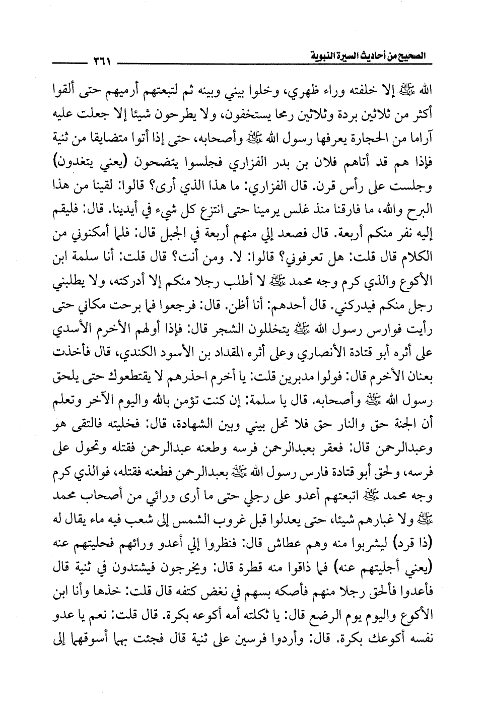 الله - صلى الله عليه وسلم - إلا خلفته وراء ظهري، وخلوا بيني وبينه ثم لتبعتهم أرميهم حتى ألقوا أكثر من ثلاثين بردة وثلاثين رمحًا يستخفون، ولا يطرحون شيئًا إلا جعلت عليه آراما من الحجارة يعرفها رسول الله - صلى الله عليه وسلم - وأصحابه، حتى إذا أتوا متضايقا من ثنية فإذا هم قد أتاهم فلان بن بدر الفزاري فجلسوا يتضحون (يعني يتغدون) وجلست على رأس قرن. قال الفزاري: ما هذا الذي أرى؟ قالوا: لقينا من هذا البرح والله، ما فارقنا منذ غلس يرمينا حتى انتزع كل شيء في أيدينا. قال: فليقم إليه نفر منكم أربعة. قال فصعد إلي منهم أربعة في الجبل قال: فلما أمكنوني من الكلام قال قلت: هل تعرفوني؟ قالوا: لا. ومن أنت؟ قال قلت: أنا سلمة ابن الأكوع والذي كرم وجه محمَّد - صلى الله عليه وسلم - لا أطلب رجلًا منكم إلا أدركته، ولا يطلبني رجل منكم فيدركني. قال أحدهم: أنا أظن. قال: فرجعوا فما برحت مكاني حتى رأيت فوارس رسول الله - صلى الله عليه وسلم - يتخللون الشجر قال: فإذا أولهم الأخرم الأسدي على أثره أبو قتادة الأنصاري وعلى أثره المقداد بن الأسود الكندي، قال فأخذت بعنان الأخرم قال: فولوا مدبرين قلت: يا أخرم احذرهم لا يقتطعوك حتى يلحق رسول الله - صلى الله عليه وسلم - وأصحابه. قال يا سلمة: إن كنت تؤمن بالله واليوم الآخر وتعلم أن الجنة حق والنار حق فلا تحل بيني وبن الشهادة، قال: فخليته فالتقى هو وعبد الرحمن قال: فعقر بعبد الرحمن فرسه وطعنه عبد الرحمن فقتله وتحول على فرسه، ولحق أبو قتادة فارس رسول الله - صلى الله عليه وسلم - بعبد الرحمن فطعنه فقتله، فوالذي كرم وجه محمَّد - صلى الله عليه وسلم - اتبعتهم أعدو على رجلي حتى ما أرى ورائي من أصحاب محمَّد - صلى الله عليه وسلم - ولا غبارهم شيئًا، حتى يعدلوا قبل غروب الشمس إلى شعب فيه ماء يقال له (ذا قرد) ليشربوا منه وهم عطاش قال: فنظروا إلي أعدو ورائهم فحليتهم عنه (يعني أجليتهم عنه) فما ذاقوا منه قطرة قال: ويخرجون فيشتدون في ثنية قال فأعدوا فألحق رجلًا منهم فأصكه بسهم في نغض كتفه قال قلت: خذها وأنا ابن الأكوع واليوم يوم الرضع قال: يا ثكلته أمه أكوعه بكرة. قال قلت: نعم يا عدو نفسه أكوعك بكرة. قال: وأردوا فرسين على ثنية قال فجئت بهما أسوقهما إلى
