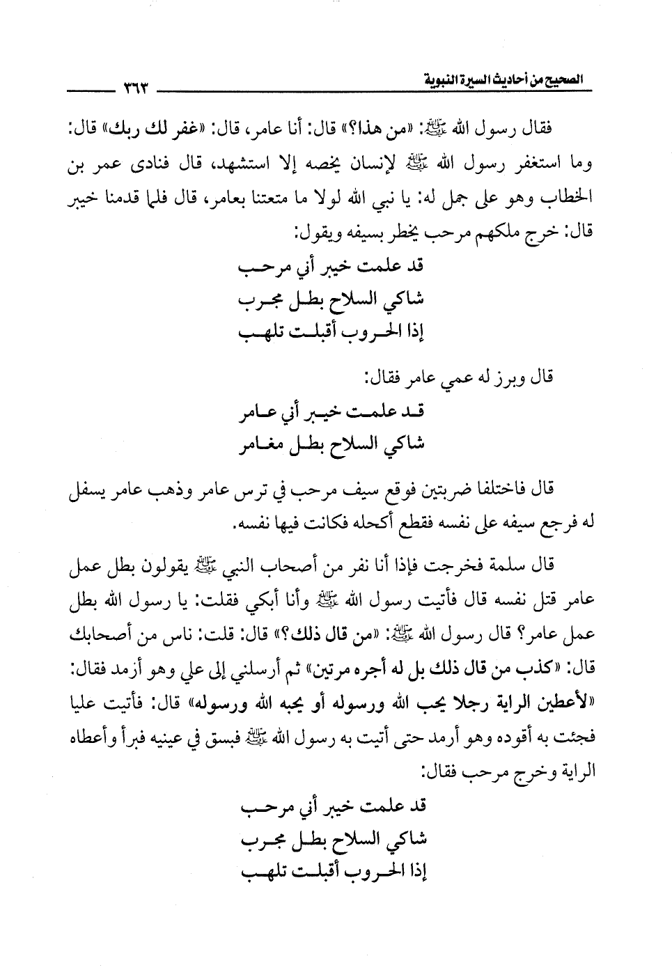 فقال رسول الله - صلى الله عليه وسلم -: "من هذا؟ " قال: أنا عامر، قال: "غفر لك ربك" قال: وما استغفر رسول الله - صلى الله عليه وسلم - لإنسان يخصه إلا استشهد، قال فنادى عمر بن الخطاب وهو على جمل له: يا نبي الله لولا ما متعتنا بعامر، قال فلما قدمنا خيبر قال: خرج ملكهم مرحب يخطر بسيفه ويقول: