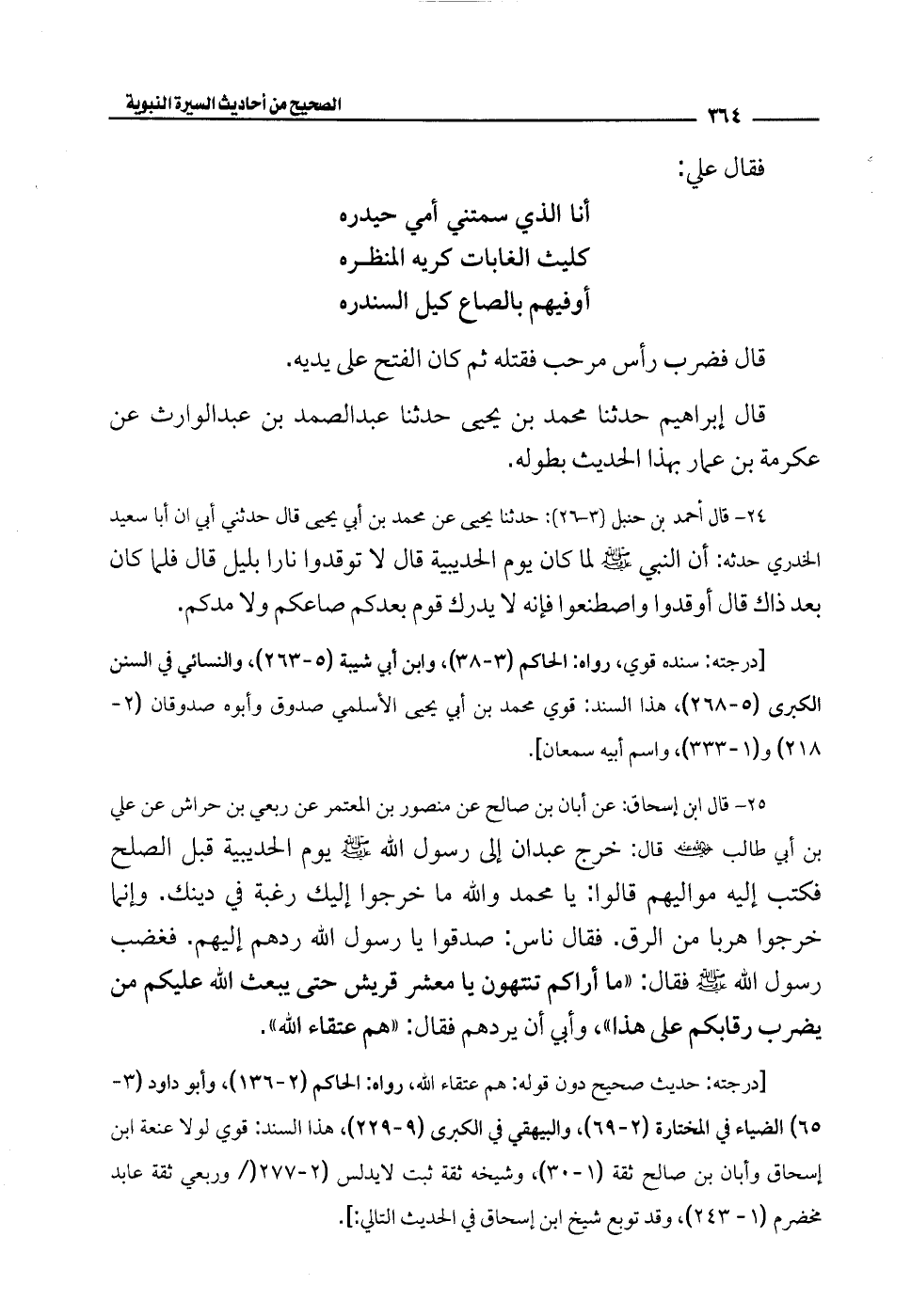 24 - قال أحمد بن حنبل (3 - 26): حدثنا يحيى عن محمَّد بن أبي يحيى قال حدثني أبي أن أبا سعيد الخدري حدثه: أن النبي - صلى الله عليه وسلم - لما كان يوم الحديبية قال لا توقدوا نارا بليل قال فلما كان بعد ذاك قال أوقدوا واصطنعوا فإنه لا يدرك قوم بعدكم صاعكم ولا مدكم.