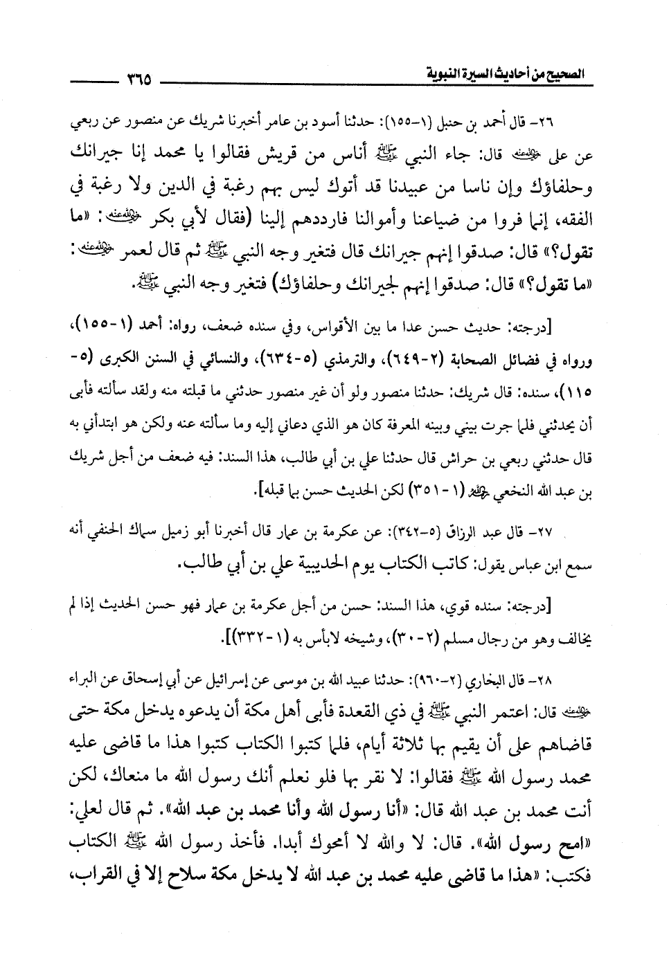 28 - قال البخاري [2 - 960]: حدثنا عبيد الله بن موسى عن إسرائيل عن أبي إسحاق عن البراء -رضي الله عنه- قال: اعتمر النبي - صلى الله عليه وسلم - في ذي القعدة فأبى أهل مكة أن يدعوه يدخل مكة حتى قاضاهم على أن يقيم بها ثلاثة أيام، فلما كتبوا الكتاب كتبوا هذا ما قاضى عليه محمَّد رسول الله - صلى الله عليه وسلم - فقالوا: لا نقر بها فلو نعلم أنك رسول الله ما منعاك، لكن أنت محمَّد بن عبد الله قال: "أنا رسول الله وأنا محمَّد بن عبد الله". ثم قال لعلي: "امح رسول الله". قال: لا والله لا أمحوك أبدا. فأخذ رسول الله - صلى الله عليه وسلم - الكتاب فكتب: "هذا ما قاضى عليه محمَّد بن عبد الله لا يدخل مكة سلاح إلا في القراب،