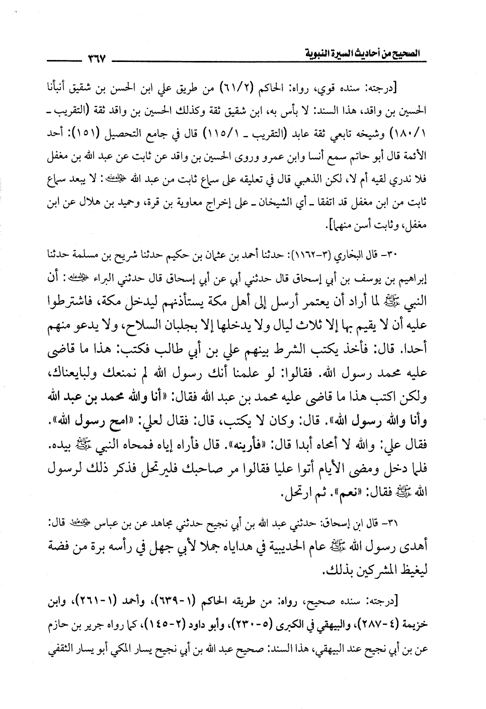 30 - قال البخاري (3 - 1162): حدثنا أحمد بن عثمان بن حكيم حدثنا شريح بن مسلمة حدثنا إبراهيم بن يوسف بن أبي إسحاق قال حدثني أبي عن أبي إسحاق قال حدثني البراء -رضي الله عنه-: أن النبي - صلى الله عليه وسلم - لما أراد أن يعتمر أرسل إلى أهل مكة يستأذنهم ليدخل مكة، فاشترطوا عليه أن لا يقيم بها إلا ثلاث ليال ولا يدخلها إلا بجلبان السلاح، ولا يدعو منهم أحدا. قال: فأخذ يكتب الشرط بينهم علي بن أبي طالب فكتب: هذا ما قاضى عليه محمَّد رسول الله. فقالوا: لو علمنا أنك رسول الله لم نمنعك ولبايعناك، ولكن اكتب هذا ما قاضى عليه محمَّد بن عبد الله فقال: "أنا والله محمَّد بن عبد الله وأنا والله رسول الله"، قال: وكان لا يكتب، قال: فقال لعلي: "امح رسول الله". فقال علي: والله لا أمحاه أبدا قال: "فأرينه". قال فأراه إياه فمحاه النبي - صلى الله عليه وسلم - بيده. فلما دخل ومضى الأيام أتوا عليا فقالوا مر صاحبك فليرتحل فذكر ذلك لرسول الله - صلى الله عليه وسلم - فقال: "نعم". ثم ارتحل.