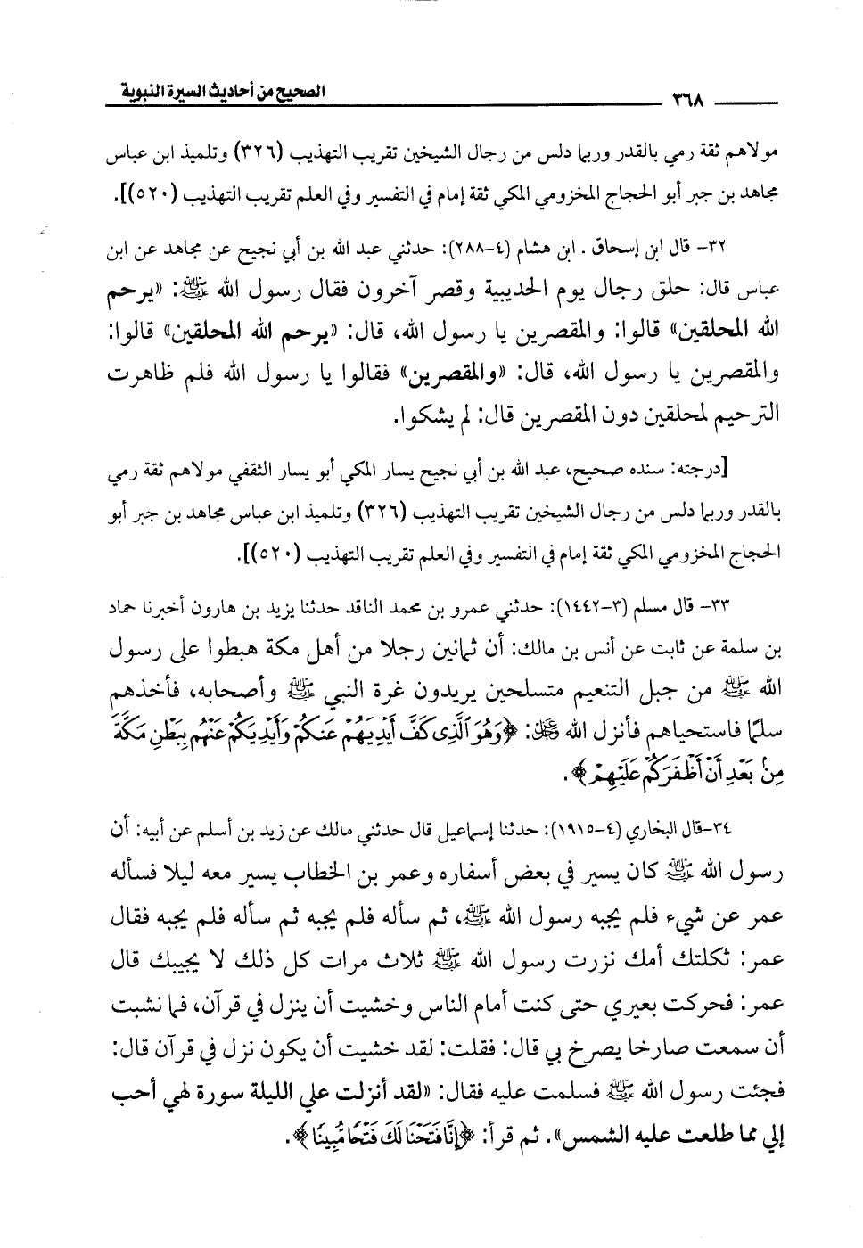 32 - قال ابن إسحاق. ابن هشام (4 - 288): حدثني عبد الله بن أبي نجيح عن مجاهد عن ابن عباس قال: حلق رجال يوم الحديبية وقصر آخرون فقال رسول الله - صلى الله عليه وسلم -: "يرحم الله المحلقين" قالوا: والمقصرين يا رسول الله، قال: "يرحم الله المحلقين" قالوا: والمقصرين يا رسول الله، قال: "والمقصرين" فقالوا يا رسول الله فلم ظاهرت الترحيم لمحلقين دون المقصرين قال: لم يشكوا.