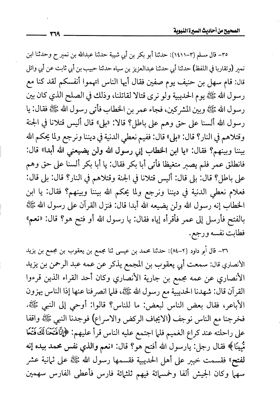 35 - قال مسلم (3 - 1411): حدثنا أبو بكر بن أبي شيبة حدثنا عبد الله بن نمير ح وحدثنا ابن نمير (وتقاربا في اللفظ) حدثنا أبي حدثنا عبد العزيز بن سياه حدثنا حبيب بن أبي ثابت عن أبي وائل قال: قام سهل بن حنيف يوم صفين فقال أيها الناس اتهموا أنفسكم لقد كنا مع رسول الله - صلى الله عليه وسلم - يوم الحديبية ولو نرى قتالا لقاتلنا، وذلك في الصلح الذي كان بين رسول الله - صلى الله عليه وسلم - وبين المشركين، فجاء عمر بن الخطاب فأتى رسول الله - صلى الله عليه وسلم - فقال: يا رسول الله ألسنا على حق وهم على باطل؟ قالا: "بلى" قال أليس قتلانا في الجنة وقتلاهم في النار؟ قال: "بلى" قال: ففيم نعطي الدنية في ديننا ونرجع ولما يحكم الله بيننا وبينهم؟ فقال: "يا ابن الخطاب إني رسول الله ولن يضيعني الله أبدا" قال: فانطلق عمر فلم يصبر متغيظا فأتى أبا بكر فقال: يا أبا بكر ألسنا على حق وهم على باطل؟ قال: بلى قال: أليس قتلانا في الجنة وقتلاهم في النار؟ قال: بلى قال: فعلام نعطي الدنية في ديننا ونرجع ولما يحكم الله بيننا وبينهم؟ فقال: يا ابن الخطاب إنه رسول الله ولن يضيعه الله أبدا قال: فنزل القرآن على رسول الله - صلى الله عليه وسلم - بالفتح فأرسل إلى عمر فأقرأه إياه فقال: يا رسول الله أوفتح هو؟ قال: "نعم" فطابت نفسه ورجع.