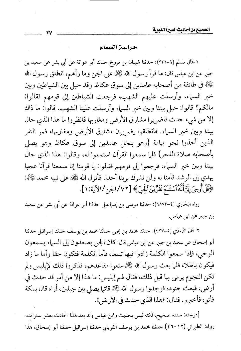 1 - قال مسلم (1 - 331): حدثنا شيبان بن فروخ حدثنا أبو عوانة عن أبي بشر عن سعيد بن جبير عن ابن عباس قال: ما قرأ رسول الله - صلى الله عليه وسلم - على الجن وما رآهم، انطلق رسول الله - صلى الله عليه وسلم - في طائفة من أصحابه عامدين إلى سوق عكاظ وقد حيل بين الشياطين وبين خبر السماء، وأرسلت عليهم الشهب فرجعت الشياطين إلى قومهم فقالوا: ما لكم؟ قالوا: حيل بيننا وبين خبر السماء وأرسلت علينا الشهب، قالوا: ما ذاك إلا من شيء حدث فاضربوا مشارق الأرض ومغاربها فانظروا ما هذا الذي حال بيننا وبين خبر السماء. فانطلقوا يضربون مشارق الأرض ومغاربها، فمر النفر الذين أخذوا نحو تهامة (وهو بنخل عامدين إلى سوق عكاظ وهو يصلي بأصحابه صلاة الفجر) فلما سمعوا القرآن استمعوا له، وقالوا: هذا الذي حال بيننا وبين خبر السماء، فرجعوا إلى قومهم فقالوا: يا قومنا إنا سمعنا قرآنًا عجبًا يهدي إلى الرشد فآمنا به ولن نشرك بربنا أحدا. فأنزل الله -عَزَّ وَجَلَّ- على نبيه محمَّد - صلى الله عليه وسلم -: {قُلْ أُوحِيَ إِلَيَّ أَنَّهُ اسْتَمَعَ نَفَرٌ مِنَ الْجِنِّ} [72/الجن/الآية/:1].