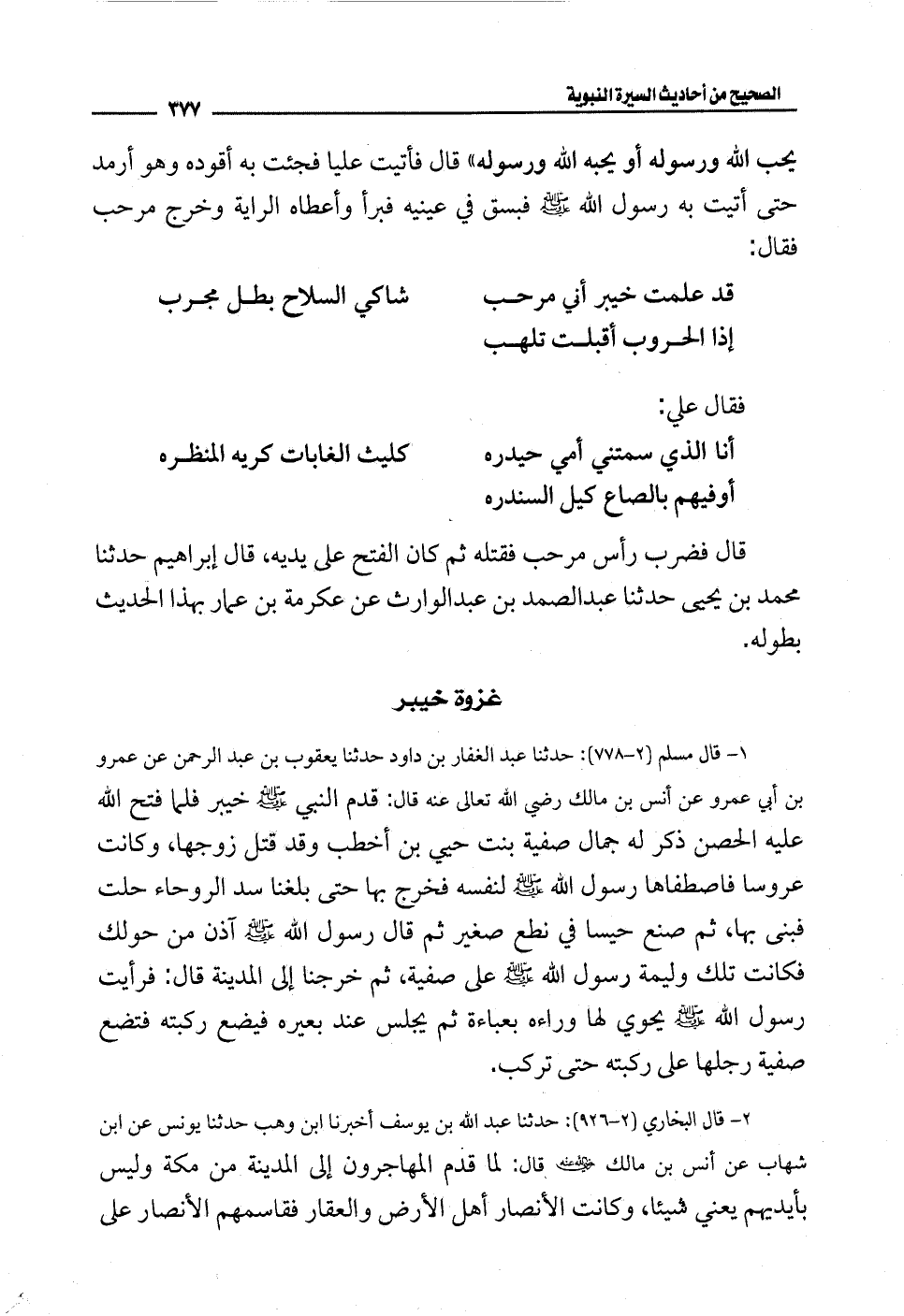 1 - قال مسلم (2 - 778): حدثنا عبد الغفار بن داود حدثنا يعقوب بن عبد الرحمن عن عمرو بن أبي عمرو عن أنس بن مالك رضي الله تعالى عنه قال: قدم النبي - صلى الله عليه وسلم - خيبر فلما فتح الله عليه الحصين ذكر له جمال صفية بنت حي بن أخطب وقد قتل زوجها، وكانت عروسا فاصطفاها رسول الله - صلى الله عليه وسلم - لنفسه فخرج بها حتى بلغنا سد الروحاء حلت فبنى بها، ثم صنع حيسا في نطع صغير ثم قال رسول الله - صلى الله عليه وسلم - آذن من حولك فكانت تلك وليمة رسول الله - صلى الله عليه وسلم - على صفية، ثم خرجنا إلى المدينة قال: فرأيت رسول الله - صلى الله عليه وسلم - يحوي لها وراءه بعباءة ثم يجلس عند بعيره فيضع ركبته فتضع صفية رجلها على ركبته حتى تركب.