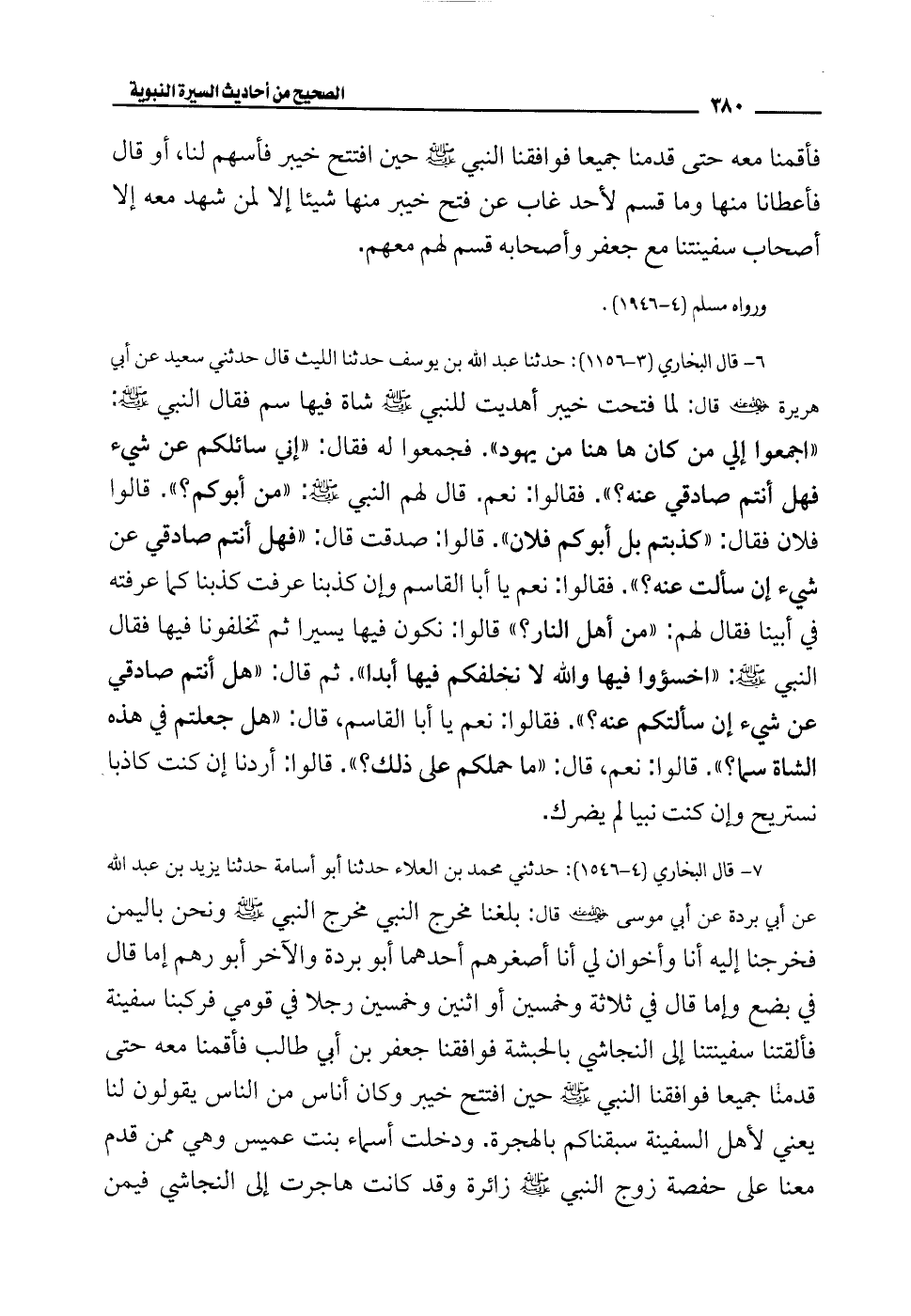7 - قال البخاري (4 - 1546): حدثني محمَّد بن العلاء حدثنا أبو أسامة حدثنا يزيد بن عبد الله عن أبي برده عن أبي موسى -رضي الله عنه- قال: بلغنا مخرج النبي مخرج النبي - صلى الله عليه وسلم - ونحن باليمن فخرجنا إليه أنا وأخوان لي أنا أصغرهم أحدهما أبو بردة والآخر أبو رهم إما قال في بضع وإما قال في ثلاثة وخمسين أو اثنين وخمسين رجلا في قومي فركبنا سفينة فألقتنا سفينتنا إلى النجاشي بالحبشة فوافقنا جعفر بن أبي طالب فأقمنا معه حتى قدمنا جميعًا فوافقنا النبي - صلى الله عليه وسلم - حين افتتح خيبر وكان أناس من الناس يقولون لنا يعني لأهل السفينة سبقناكم بالهجرة. ودخلت أسماء بنت عميس وهي ممّن قدم معنا على حفصة زوج النبي - صلى الله عليه وسلم - زائرة وقد كانت هاجرت إلى النجاشي فيمن