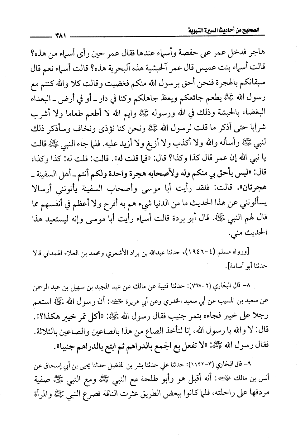 9 - قال البخاري (3 - 1122): حدثنا علي حدثنا بشر بن المفضل حدثنا يحيى بن أبي إسحاق عن أنس بن مالك -رضي الله عنه-: أنه أقبل هو وأبو طلحة مع النبي - صلى الله عليه وسلم - ومع النبي - صلى الله عليه وسلم - صفية مردفها على راحلته، فلما كانوا ببعض الطريق عثرت الناقة فصرع النبي - صلى الله عليه وسلم - والمرأة