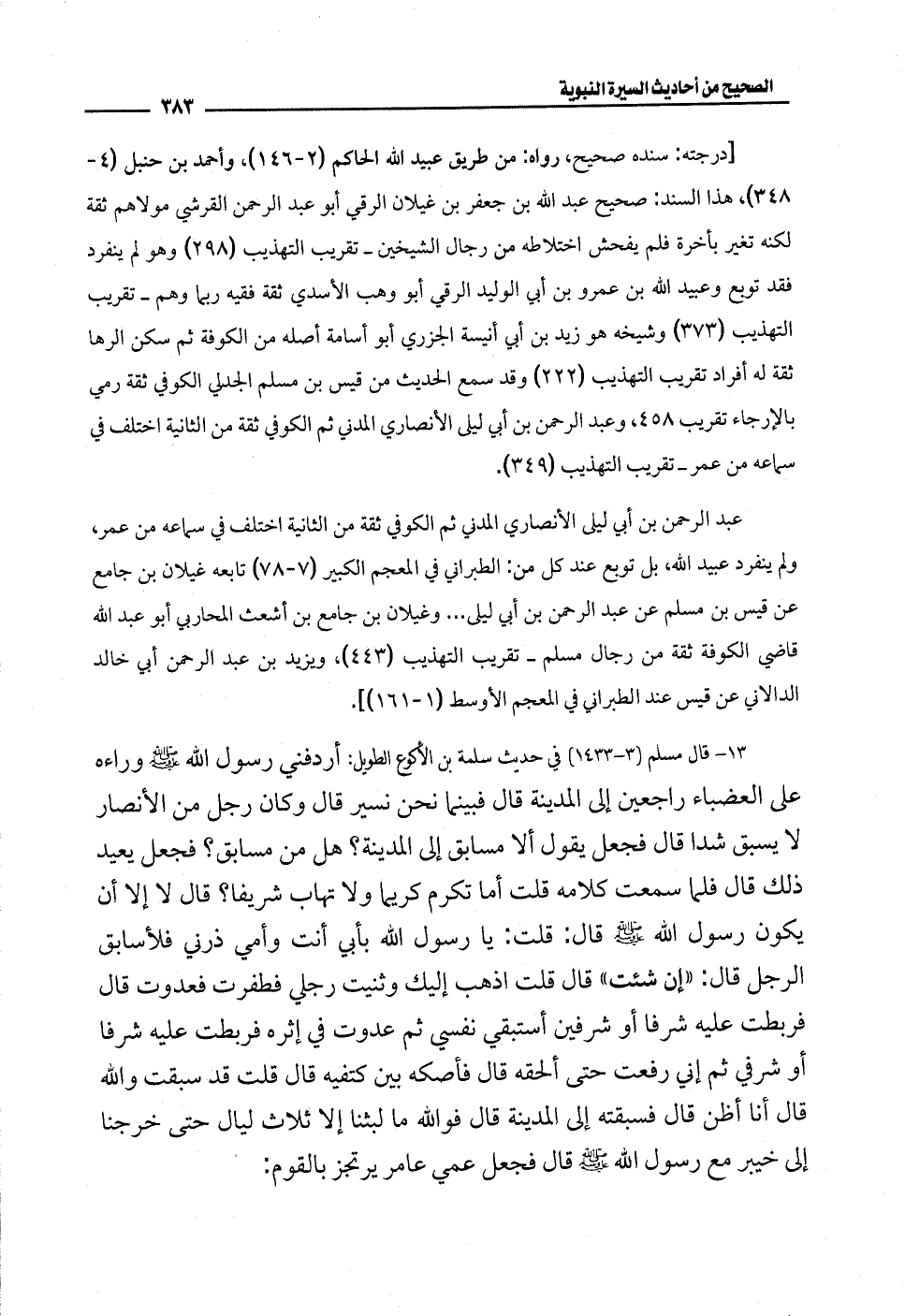 13 - قال مسلم (3 - 1433) في حديث سلمة بن الأكوع الطويل: أردفني رسول الله - صلى الله عليه وسلم - وراءه على العضباء راجعين إلى المدينة قال فبينما نحن نسير قال وكان رجل من الأنصار لا يسبق شدا قال فجعل يقول ألا مسابق إلى المدينة؟ هل من مسابق؟ فجعل يعيد ذلك قال فلما سمعت كلامه قلت أما تكرم كريما ولا تهاب شريفا؟ قال لا إلا أن يكون رسول الله - صلى الله عليه وسلم - قال: قلت: يا رسول الله بأبي أنت وأمي ذرني فلأسابق الرجل قال: "إن شئت" قال قلت اذهب إليك وثنيت رجلي فطفرت فعدوت قال فربطت عليه شرفا أو شرفين أستبقي نفسي ثم عدوت في إثره فربطت عليه شرفا أو شرفي ثم إني رفعت حتى ألحقه قال فأصكه بين كتفيه قال قلت قد سبقت والله قال أنا أظن قال فسبقته إلى المدينة قال فوالله ما لبثنا إلا ثلاث ليال حتى خرجنا إلى خيبر مع رسول الله - صلى الله عليه وسلم - قال فجعل عمي عامر يرتجز بالقوم:
