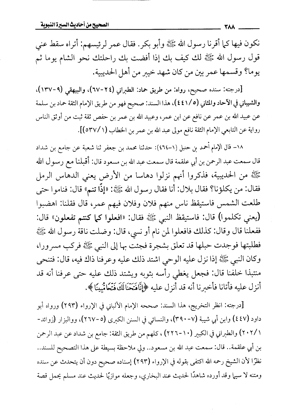 18 - قال الإِمام أحمد بن حنبل (1 - 464): حدثنا محمَّد بن جعفر ثنا شعبة عن جامع بن شداد قال سمعت عبد الرحمن بن أبي علقمة قال سمعت عبد الله بن مسعود قال: أقبلنا مع رسول الله - صلى الله عليه وسلم - من الحديبية، فذكروا أنهم نزلوا دهاسا من الأرض يعني الدهاس الرمل فقال: من يكلؤنا؟ فقال بلال: أنا فقال رسول الله - صلى الله عليه وسلم -: "إذًا تنم" قال: فناموا حتى طلعت الشمس فاستيقظ ناس منهم فلان وفلان فيهم عمر، قال فقلنا: اهضبوا (يعني تكلموا) قال: فاستيقظ النبي - صلى الله عليه وسلم - فقال: "افعلوا كما كنتم تفعلون" قال: ففعلنا قال وقال: كذلك فافعلوا لمن نام أو نسي، قال: وضلت ناقة رسول الله - صلى الله عليه وسلم - فطلبتها فوجدت حبلها قد تعلق بشجرة فجئت بها إلى النبي - صلى الله عليه وسلم - فركب مسرورا، وكان النبي - صلى الله عليه وسلم - إذا نزل عليه الوحي اشتد ذلك عليه وعرفنا ذاك فيه، قال: فتنحى منتبذا خلفنا قال: فجعل يغطي رأسه بثوبه ويشتد ذلك عليه حتى عرفنا أنه قد أنزل عليه فأتانا فأخبرنا أنه قد أنزل عليه {إِنَّا فَتَحْنَا لَكَ فَتْحًا مُبِينًا}.