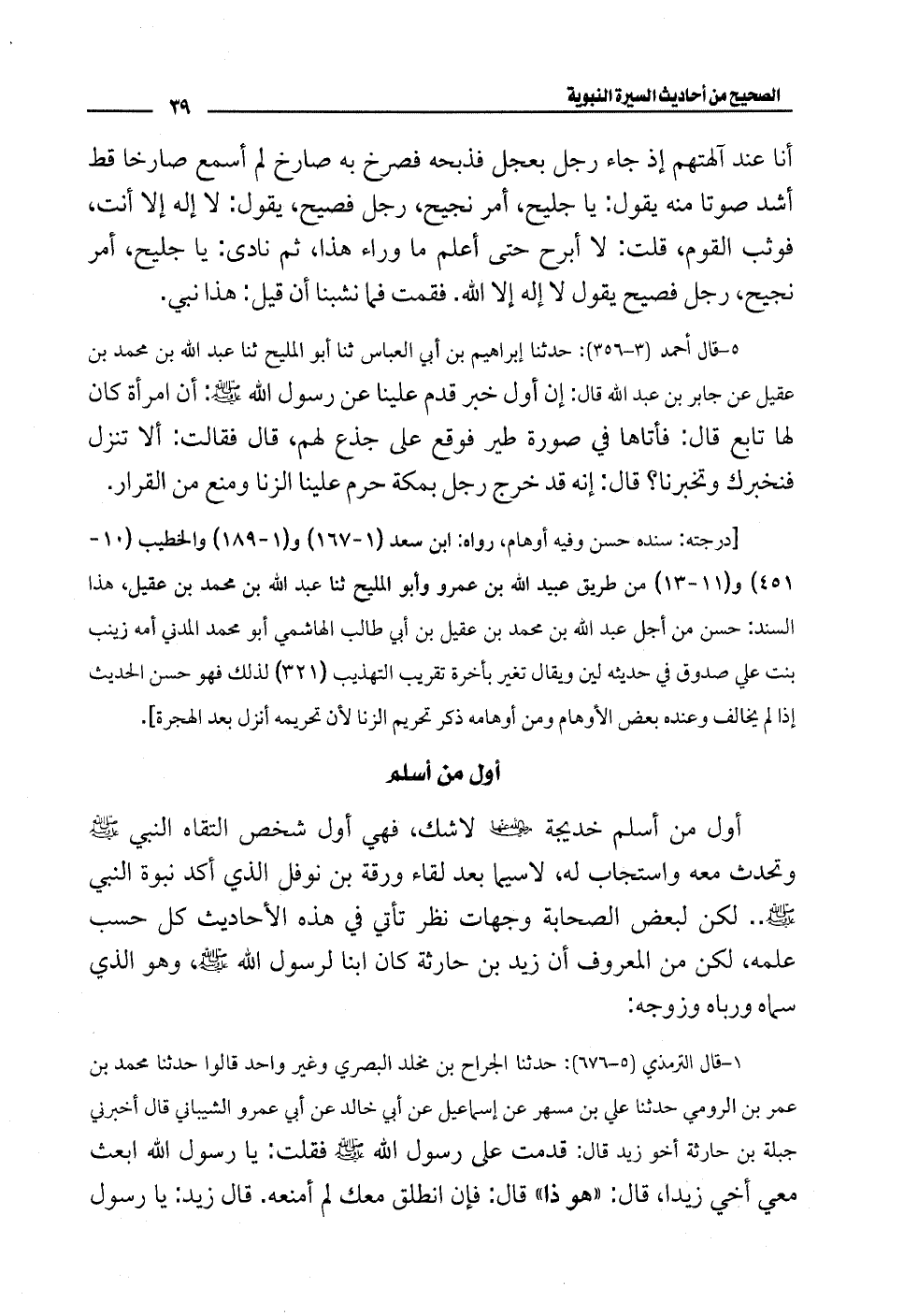 1 - فقال الترمذيُّ (5 - 676): حدثنا الجراح بن مخلد البصري وغير واحد قالوا حدثنا محمَّد بن عمر بن الرومي حدثنا علي بن مسهر عن إسماعيل عن أبي خالد عن أبي عمرو الشيباني قال أخبرني جبلة بن حارثة أخو زيد قال: قدمت على رسول الله - صلى الله عليه وسلم - فقلت: يا رسول الله ابعث معي أخي زيدًا، قال: "هو ذا" قال: فإن انطلق معك لم أمنعه. قال زيد: يا رسول