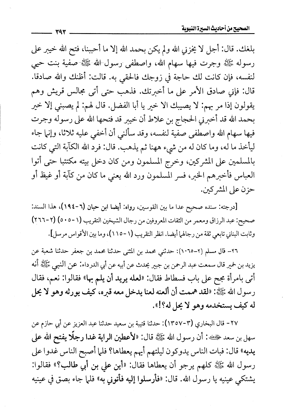 26 - قال مسلم (2 - 1065): حدثني محمَّد بن المثنى حدثنا محمَّد بن جعفر حدثنا شعبة عن يزيد بن خمير قال سمعت عبد الرحمن بن جبير يحدث عن أبيه عن أبي الدرداء: عن النبي - صلى الله عليه وسلم - أنه أتى بامرأة مجح على باب فسطاط فقال: "لعله يريد أن يلم بها" فقالوا: نعم، فقال رسول الله - صلى الله عليه وسلم -: "لقد هممت أن ألعنه لعنا يدخل معه قبره، كيف يورثه وهو لا يحل له كيف يستخدمه وهو لا يحل له؟! ".
