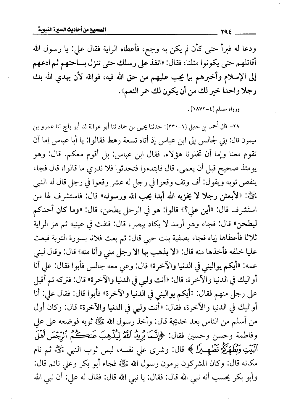 28 - قال أحمد في حنبل (1 - 330): حدثنا يحيى بن حماد ثنا أبو عوانة ثنا أبو بلج ثنا عمرو بن ميمون قال: إني لجالس إلى ابن عباس إذ أتاه تسعة رهط فقالوا: يا أبا عباس إما أن تقوم معنا وإما أن تخلونا هؤلاء. فقال ابن عباس: بل أقوم معكم. قال: وهو يومئذ صحيح قبل أن يعمى. قال فابتدءوا فتحدثوا فلا ندري ما قالوا، قال فجاء ينفض ثوبه ويقول: أف وتف وقعوا في رجل له عشر وقعوا في رجل قال له النبي - صلى الله عليه وسلم -: "لأبعثن رجلًا لا يخزيه الله أبدا يحب الله ورسوله" قال: فاستشرف لها من استشرف قال: "أين علي؟ " قالوا: هو في الرحل يطحن، قال:"وما كان أحدكم ليطحن" قال: فجاء وهو أرمد لا يكاد يبصر، قال: فنفث في عينيه ثم هز الراية ثلاثًا فأعطاها إياه فجاء بصفية بنت حيي قال: ثم بعث فلانا بسورة التوبة فبعث عليًا خلفه فأخذها منه قال: "لا يذهب بها إلارجل مني وأنا منه" قال: وقال لبني عمه: "أيكم يواليني في الدنيا والآخرة" قال: وعلي معه جالس فأبوا فقال: علي أنا أواليك في الدنيا والآخرة، قال: "أنت وليي في الدنيا والآخرة" قال: فتركه ثم أقبل على رجل منهم فقال: "أيكم يواليني في الدنيا والآخرة" فأبوا قال: فقال علي: أنا أواليك في الدنيا والآخرة، فقال: "أنت وليي في الدنيا والآخرة" قال: وكان أول من أسلم من الناس بعد خديجة قال: وأخذ رسول الله - صلى الله عليه وسلم - ثوبه فوضعه على علي وفاطمة وحسن وحسين فقال: {إِنَّمَا يُرِيدُ اللَّهُ لِيُذْهِبَ عَنْكُمُ الرِّجْسَ أَهْلَ الْبَيْتِ وَيُطَهِّرَكُمْ تَطْهِيرًا} قال: وشرى علي نفسه، لبس ثوب النبي - صلى الله عليه وسلم - ثم نام مكانه قال: وكان المشركون يرمون رسول الله - صلى الله عليه وسلم - فجاء أبو بكر وعلي نائم قال: وأبو بكر يحسب أنه نبي الله قال: فقال: يا نبي الله قال: فقال له علي: أن نبي الله