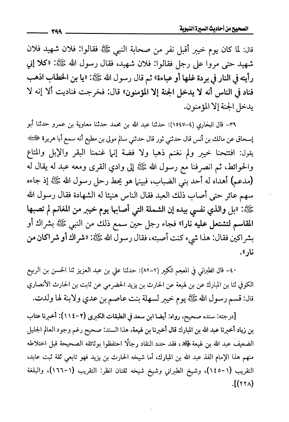 39 - قال البخاري (4 - 1547): حدثنا عبد الله بن محمَّد حدثنا معاوية بن عمرو حدثنا أبو إسحاق عن مالك بن أنس قال حدثني ثور قال حدثني سالم مولى بن مطيع أنه سمع أبا هريرة -رضي الله عنه- يقول: افتتحنا خيبر ولم نغنم ذهبا ولا فضة إنما غنمنا البقر والإبل والمتاع والحوائط ثم انصرفنا مع رسول الله - صلى الله عليه وسلم - إلى وادي القرى ومعه عبد له يقال له (مدعم) أهداه له أحد بني الضباب، فبينما هو يحط رحل رسول الله - صلى الله عليه وسلم - إذ جاءه سهم عائر حتى أصاب ذلك العبد فقال الناس هنيئا له الشهادة فقال رسول الله - صلى الله عليه وسلم -: "بل والذي نفسي بيده إن الشملة التي أصابها يوم خيبر من المغانم لم تصبها المقاسم لتشتعل عليه نارا" فجاء رجل حين سمع ذلك من النبي - صلى الله عليه وسلم - بشراك أو بشراكين فقال: هذا شيء كنت أصبته، فقال رسول الله - صلى الله عليه وسلم -: "شراك أو شراكان من نار".