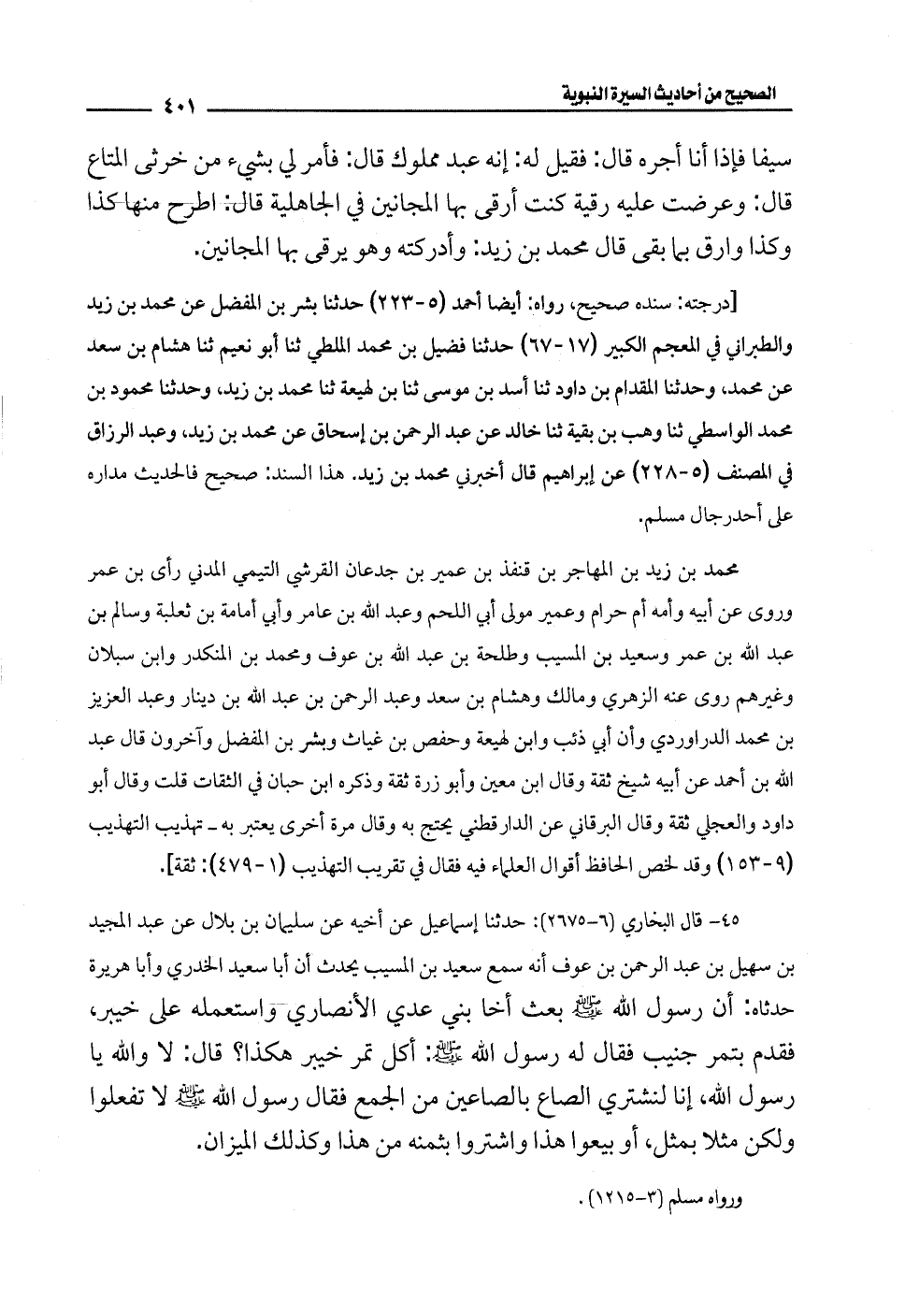 45 - قال البخاري (6 - 2675): حدثنا إسماعيل عن أخيه عن سليمان بن بلال عن عبد المجيد بن سهيل بن عبد الرحمن بن عوف أنه سمع سعيد بن المسيب يحدث أن أبا سعيد الخدري وأبا هريرة حدثاه: أن رسول الله - صلى الله عليه وسلم - بعث أخا بني عدي الأنصاري واستعمله على خيبر، فقدم بتمر جنيب فقال له رسول الله - صلى الله عليه وسلم -: أكل تمر خيبر هكذا؟ قال: لا والله يا رسول الله، إنا لنشتري الصالح بالصاعين من الجمع فقال رسول الله - صلى الله عليه وسلم - لا تفعلوا ولكن مثلا بمثل، أو بيعوا هذا واشتروا بثمنه من هذا وكذلك الميزان.