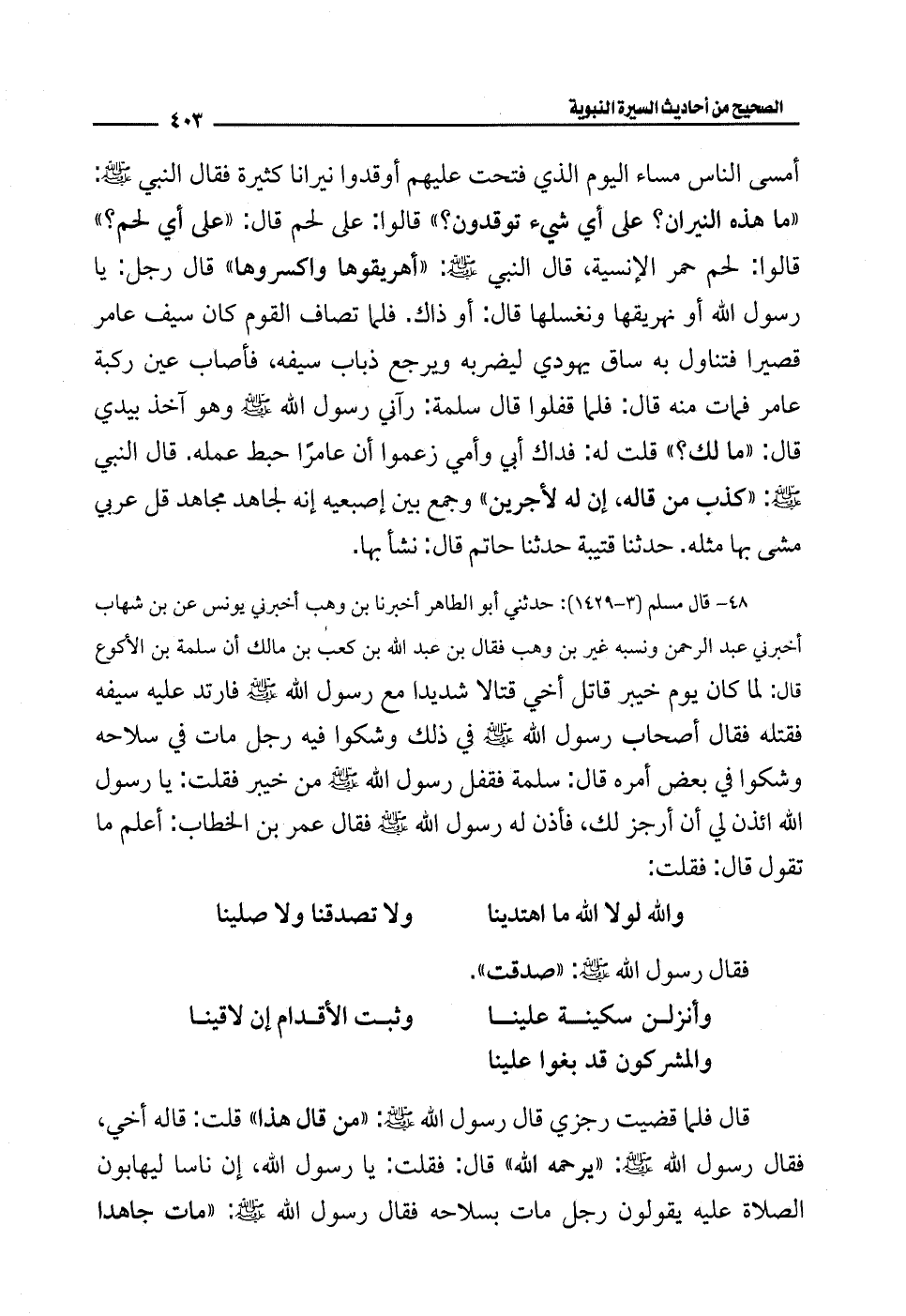 48 - قال مسلم (3 - 1429): حدثني أبو الطاهر أخبرنا بن وهب أخبرني يونس عن بن شهاب أخبرني عبد الرحمن ونسبه غير بن وهب فقال بن عبد الله بن كعب بن مالك أن سلمة بن الأكوع قال: لما كان يوم خيبر قاتل أخي قتالا شديدا مع رسول الله - صلى الله عليه وسلم - فارتد عليه سيفه فقتله فقال أصحاب رسول الله - صلى الله عليه وسلم - في ذلك وشكوا فيه رجل مات في سلاحه وشكوا في بعض أمره قال: سلمة فقفل رسول الله - صلى الله عليه وسلم - من خيبر فقلت: يا رسول الله ائذن لي أن أرجز لك، فأذن له رسول الله - صلى الله عليه وسلم - فقال عمر بن الخطاب: أعلم ما تقول قال: فقلت: