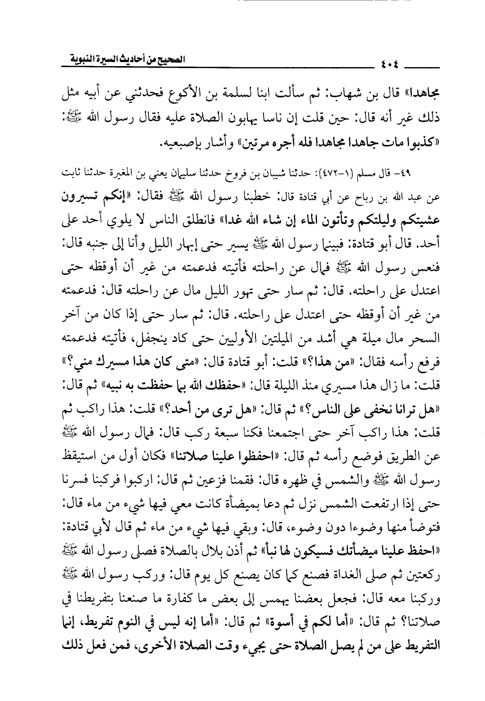 49 - قال مسلم (1 - 472): حدثنا شيبان بن فروخ حدثنا سليمان يعني بن المغيرة حدثنا ثابت عن عبد الله بن رباح عن أبي قتادة قال: خطبنا رسول الله - صلى الله عليه وسلم - فقال: "إنكم تسيرون عشيتكم وليلتكم وتأتون الماء إن شاء الله غدا" فانطلق الناس لا يلوي أحد على أحد. قال أبو قتادة: فبينما رسول الله - صلى الله عليه وسلم - يسير حتى إبهار الليل وأنا إلى جنبه قال: فنعس رسول الله - صلى الله عليه وسلم - فمال عن راحلته فأتيته فدعمته من غير أن أوقظه حتى اعتدل على راحلته. قال: ثم سار حتى تهور الليل مال عن راحلته قال: فدعمته من غير أن أوقظه حتى اعتدل على راحلته. قال: ثم سار حتى إذا كان من آخر السحر مال ميلة هي أشد من الميلتين الأوليين حتى كاد ينجفل، فأتيته فدعمته فرفع رأسه فقال. "من هذا؟ " قلت: أبو قتادة قال: "متى كان هذا مسيرك مني؟ " قلت: ما زال هذا مسيري منذ الليلة قال: "حفظك الله بما حفظت به نبيه" ثم قال: "هل ترانا نخفى على الناس؟ " ثم قال: "هل ترى من أحد؟ " قلت: هذا راكب ثم قلت: هذا راكب آخر حتى اجتمعنا فكنا سبعة ركب قال: فمال رسول الله - صلى الله عليه وسلم - عن الطريق فوضع رأسه ثم قال: "احفظوا علينا صلاتنا" فكان أول من استيقظ رسول الله - صلى الله عليه وسلم - والشمس في ظهره قال: فقمنا فزعين ثم قال: اركبوا فركبنا فسرنا حتى إذا ارتفعت الشمس نزل ثم دعا بميضأة كانت معي فيها شيء من ماء قال: فتوضأ منها وضوءًا دون وضوء، قال: وبقي فيها شيء من ماء ثم قال لأبي قتادة: "احفظ علينا ميضأتك فسيكون لها نبأ" ثم أذن بلال بالصلاة فصلى رسول الله - صلى الله عليه وسلم - ركعتين ثم صلى الغداة فصنع كما كان يصنع كل يوم قال: وركب رسول الله - صلى الله عليه وسلم - وركبنا معه قال: فجعل بعضنا يهمس إلى بعض ما كفارة ما صنعنا بتفريطنا في صلاتنا؟ ثم قال: "أما لكم في أسوة" ثم قال: "أما إنه ليس في النوم تفريط، إنما التفريط على من لم يصل الصلاة حتى يجيء وقت الصلاة الأخرى، فمن فعل ذلك