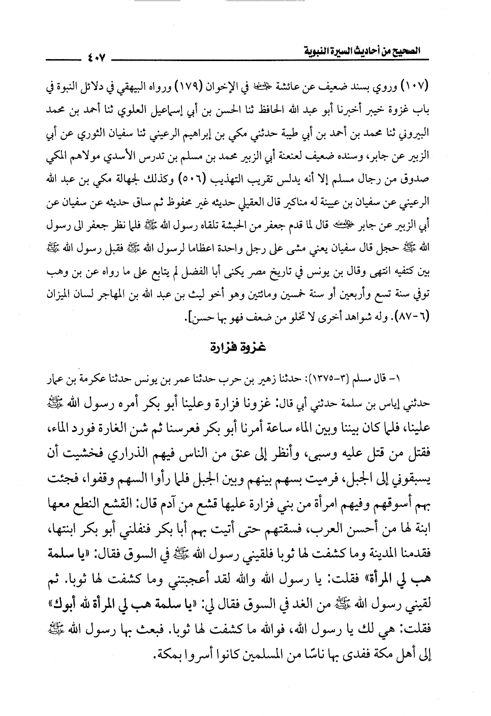 1 - قال مسلم (3 - 1375): حدثنا زهير بن حرب حدثنا عمر بن يونس حدثنا عكرمة بن عمار حدثني إياس بن سلمة حدثني أبي قال: غزونا فزارة وعلينا أبو بكر أمره رسول الله - صلى الله عليه وسلم - علينا، فلما كان بيننا وبين الماء ساعة أمرنا أبو بكر فعرسنا ثم شن الغارة فورد الماء، فقتل من قتل عليه وسبى، وأنظر إلى عنق من الناس فيهم الذراري فخشيت أن يسبقوني إلى الجبل، فرميت بسهم بينهم وبين الجبل فلما رأوا السهم وقفوا، فجئت بهم أسوقهم وفيهم امرأة من بني فزارة عليها قشع من آدم قال: القشع النطع معها ابنة لها من أحسن العرب، فسقتهم حتى أتيت بهم أبا بكر فنفلني أبو بكر ابنتها، فقدمنا المدينة وما كشفت لها ثوبًا فلقيني رسول الله - صلى الله عليه وسلم - في السوق فقال: "يا سلمة هب لي المرأة" فقلت. يا رسول الله والله لقد أعجبتني وما كشفت لها ثوبا. ثم لقيني رسول الله - صلى الله عليه وسلم - من الغد في السوق فقال لي: "يا سلمة هب لي المرأة لله أبوك" فقلت: هي لك يا رسول الله، فوالله ما كشفت لها ثوبا. فبعث بها رسول الله - صلى الله عليه وسلم - إلى أهل مكة ففدى بها ناسًا من المسلمين كانوا أسروا بمكة.