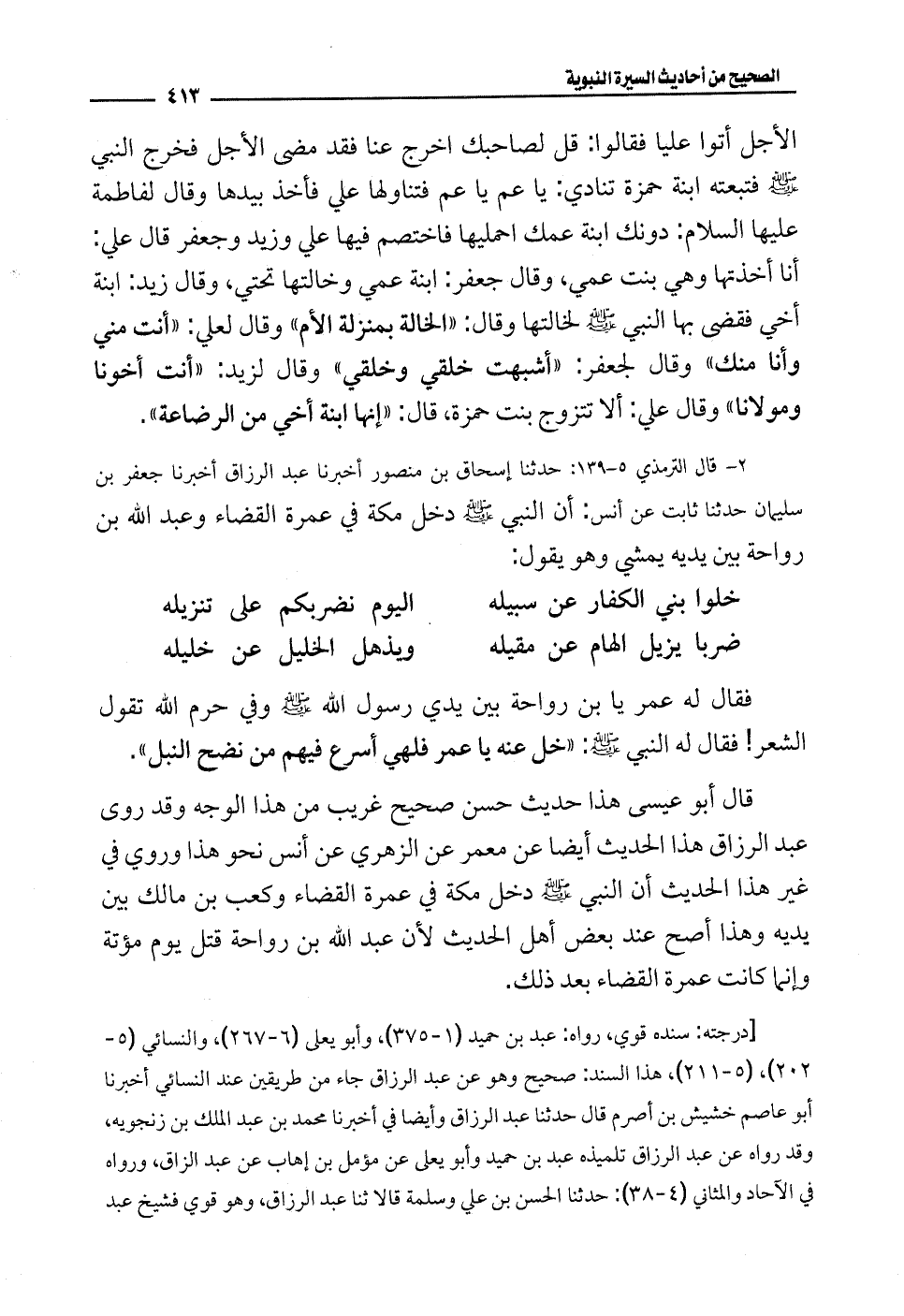 2 - قال الترمذيُّ 5 - 139: حدثنا إسحاق بن منصور أخبرنا عبد الرزاق أخبرنا جعفر بن سليمان حدثنا ثابت عن أنس: أن النبي - صلى الله عليه وسلم - دخل مكة في عمرة القضاء وعبد الله بن رواحة بين يديه يمشي وهو يقول: