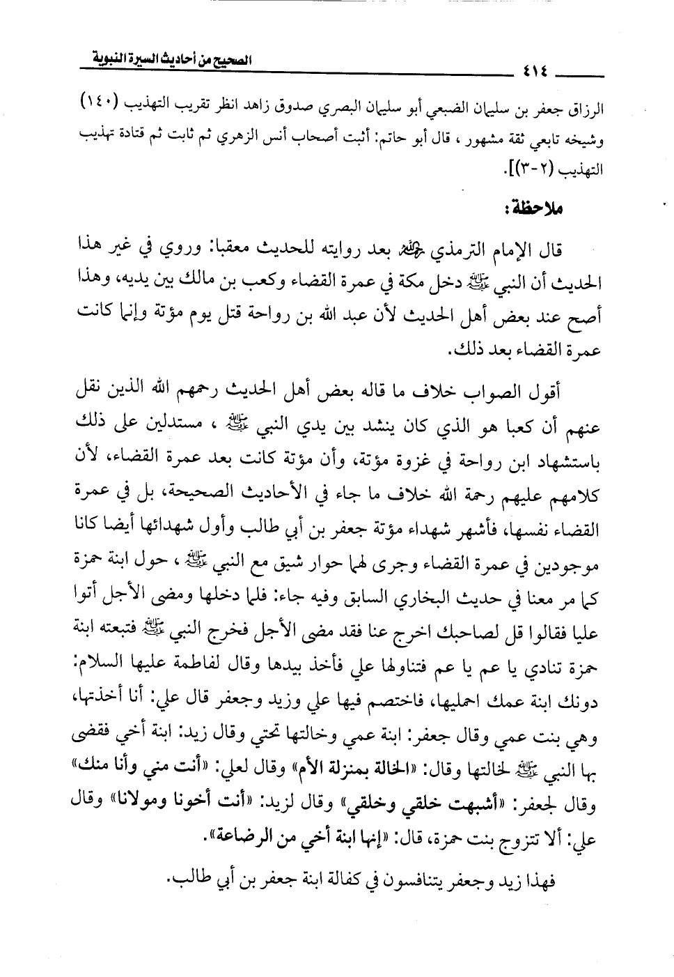 أقول الصواب خلاف ما قاله بعض أهل الحديث رحمهم الله الذين نقل عنهم أن كعبا هو الذي كان ينشد بين يدي النبي - صلى الله عليه وسلم -، مستدلين على ذلك باستشهاد ابن رواحة في غزوة مؤتة، وأن مؤتة كانت بعد عمرة القضاء، لأن كلامهم عليهم رحمة الله خلاف ما جاء في الأحاديث الصحيحة, بل في عمرة القضاء نفسها، فأشهر شهداء مؤتة جعفر بن أبي طالب وأول شهدائها أيضًا كانا موجودين في عمرة القضاء وجرى لهما حوار شيق مع النبي - صلى الله عليه وسلم -، حول ابنة حمزة كما مر معنا في حديث البخاري السابق وفيه جاء: فلما دخلها ومضى الأجل أتوا عليا فقالوا قل لصاحبك اخرج عنا فقد مضى الأجل فخرج النبي - صلى الله عليه وسلم - فتبعته ابنة حمزة تنادي يا عم يا عم فتناولها علي فأخذ بيدها وقال لفاطمة عليها السلام: دونك ابنة عمك احمليها، فاختصم فيها علي وزيد وجعفر قال علي: أنا أخذتها، وهي بنت عمي وقال جعفر: ابنة عمي وخالتها تحتي وقال زيد: ابنة أخي فقضى بها النبي - صلى الله عليه وسلم - لخالتها وقال: "الخالة بمنزلة الأم" وقال لعلي: "أنت مني وأنا منك" وقال لجعفر: "أشبهت خلقي وخلقي" وقال زيد: "أنت أخونا ومولانا" وقال علي: ألا تتزوج بنت حمزة، قال: "إنها ابنة أخي من الرضاعة".