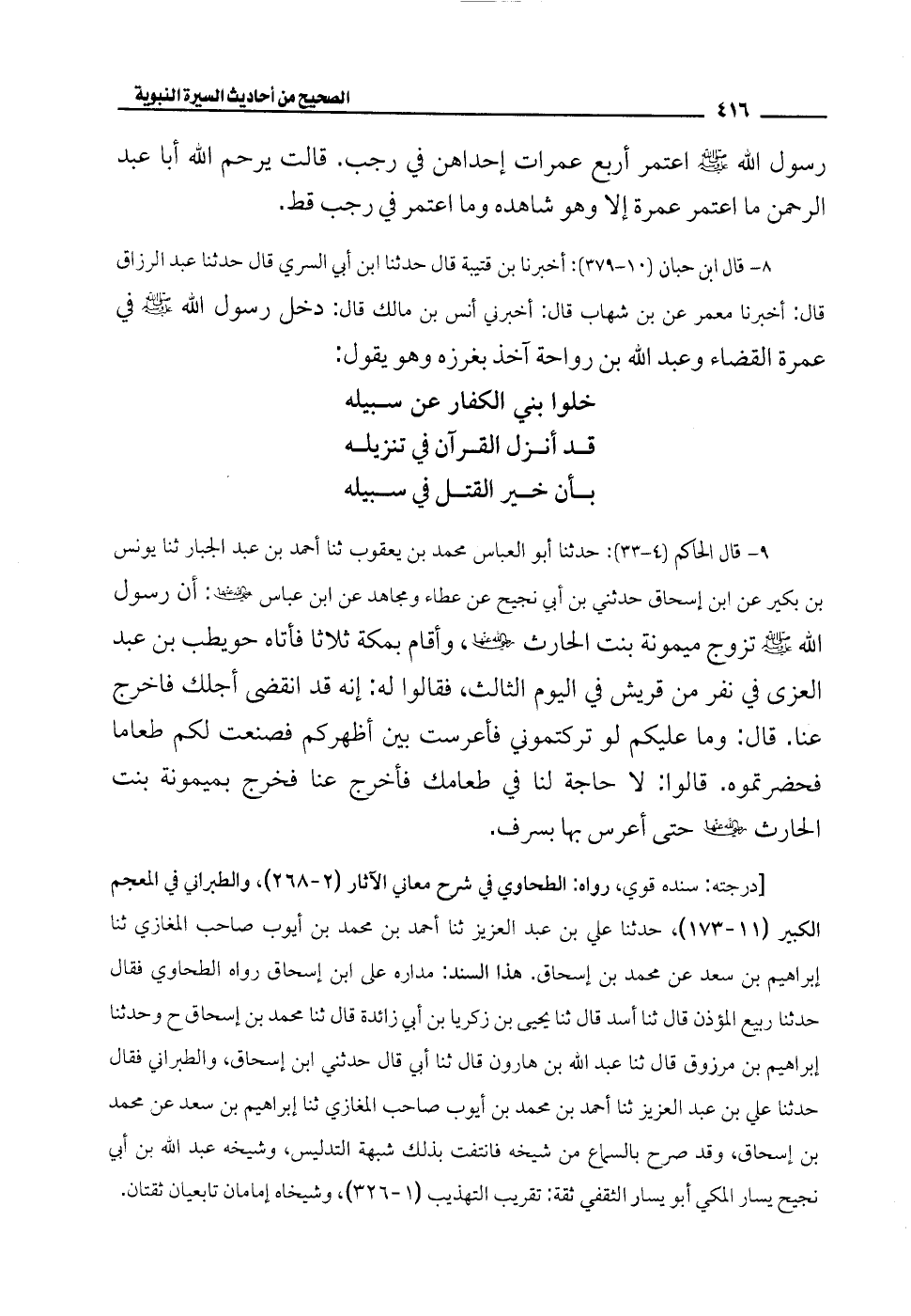 8 - قال ابن حبان (10 - 379): أخبرنا بن قتيبة قال حدثنا ابن أبي السري قال حدثنا عبد الرزاق قال: أخبرنا معمر عن بن شهاب قال: أخبرني أنس بن مالك قال: دخل رسول الله - صلى الله عليه وسلم - في عمرة القضاء وعبد الله بن رواحة آخذ بغرزه وهو يقول: