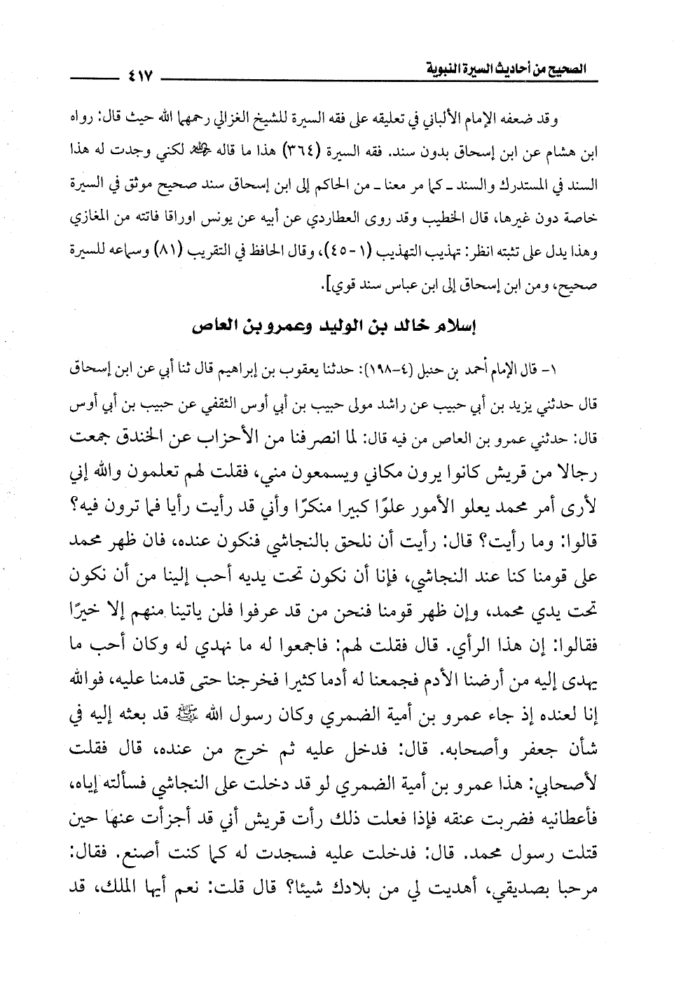 وقد ضعفه الإِمام الألباني في تعليقه على فقه السيرة للشيخ الغزالي رحمهما الله حيث قال: رواه ابن هشام عن ابن إسحاق بدون سند. فقه السيرة (364) هذا ما قاله -رحمه الله- لكني وجدت له هذا السند في المستدرك والسند -كما مر معنا- من الحاكم إلى ابن إسحاق سند صحيح موثق في السيرة خاصة دون غيرها، قال الخطيب وقد روى العطاردي عن أبيه عن يونس اوراقا فاتته من المغازي وهذا يدل على تثبته انظر: تهذيب التهذيب (1 - 45)، وقال الحافظ في التقريب (81) وسماعه للسيرة صحيح، ومن ابن إسحاق إلى ابن عباس سند قوي].