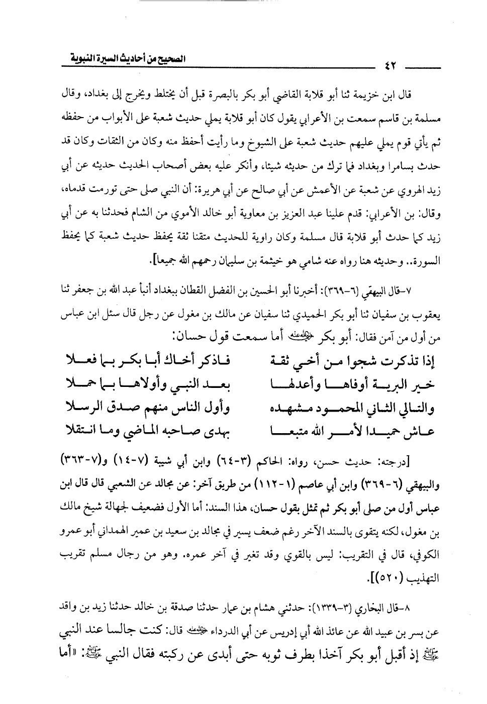 7 - قال البيهقي (6 - 369): أخبرنا أبو الحسين بن الفضل القطان ببغداد أنبأ عبد الله بن جعفر ثنا يعقوب بن سفيان ثنا أبو بكر الحميدي ثنا سفيان عن مالك بن مغول عن رجل قال سئل ابن عباس من أول من آمن فقال: أبو بكر -رضي الله عنه - أما سمعت قول حسان: