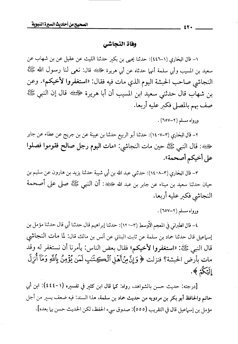 1 - قال البخاري (1 - 446): حدثنا يحيى بن بكير حدثنا الليث عن عقيل عن بن شهاب عن سعيد بن المسيب وأبي سلمة أنهما حدثاه عن أبي هريرة -رضي الله عنه- قال: نعى لنا رسول الله - صلى الله عليه وسلم - النجاشي صاحب الحبشة اليوم الذي مات فيه فقال: "استغفروا لأخيكم". وعن بن شهاب قال حدثني سعيد ابن المسيب أن أبا هريرة -رضي الله عنه- قال إن النبي - صلى الله عليه وسلم - صف بهم بالمصلى فكبر عليه أربعًا.