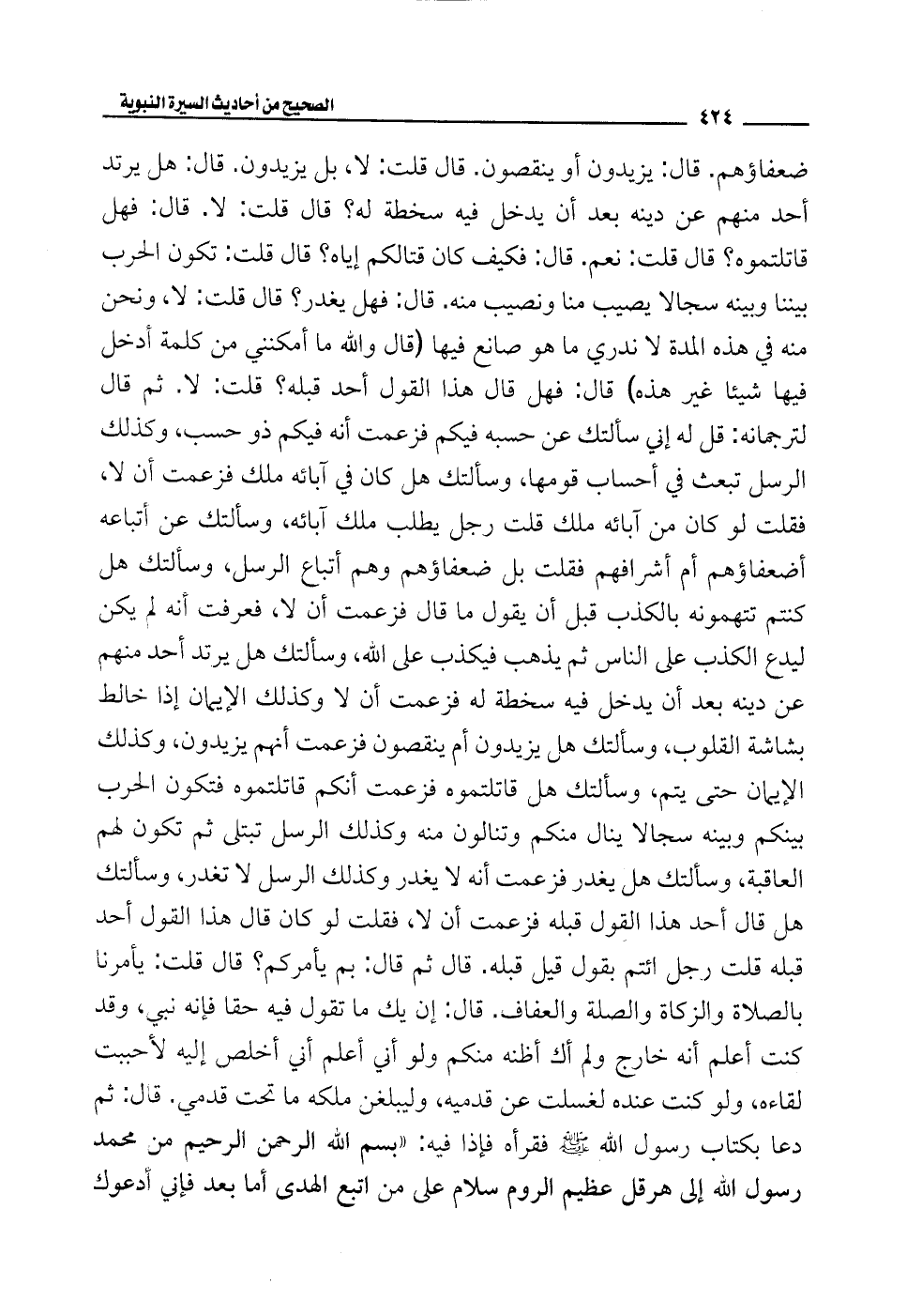 ضعفاؤهم، قال: يزيدون أو ينقصون. قال قلت: لا، بل يزيدون. قال: هل يرتد أحد منهم عن دينه بعد أن يدخل فيه سخطة له؟ قال قلت: لا. قال: فهل قاتلتموه؟ قال قلت: نعم. قال: فكيف كان قتالكم إياه؟ قال قلت: تكون الحرب بيننا وبينه سجالا يصيب منا ونصيب منه. قال: فهل يغدر؟ قال قلت: لا، ونحن منه في هذه المدة لا ندري ما هو صانع فيها (قال والله ما أمكنني من كلمة أدخل فيها شيئًا غير هذه) قال: فهل قال هذا القول أحد قبله؟ قلت: لا. ثم قال لترجمانه: قل له إني سألتك عن حسبه فيكم فزعمت أنه فيكم ذو حسب، وكذلك الرسل تبعث في أحساب قومها، وسألتك هل كان في آبائه ملك فزعمت أن لا، فقلت لو كان من آبائه ملك قلت رجل يطلب ملك آبائه، وسألتك عن أتباعه أضعفاؤهم أم أشرافهم فقلت بل ضعفاؤهم وهم أتباع الرسل، وسألتك هل كنتم تتهمونه بالكذب قبل أن يقول ما قال فزعمت أن لا، فعرفت أنه لم يكن ليدع الكذب على الناس ثم يذهب فيكذب على الله، وسألتك هل يرتد أحد منهم عن دينه بعد أن يدخل فيه سخطة له فزعمت أن لا وكذلك الإيمان إذا خالط بشاشة القلوب، وسألتك هلى يزيدون أم ينقصون فزعمت أنهم يزيدون، وكذلك الإيمان حتى يتم، وسألتك هل قاتلتموه فزعمت أنكم قاتلتموه فتكون الحرب بينكم وبينه سجالا ينال منكم وتنالون منه وكذلك الرسل تبتلى ثم تكون لهم العاقبة، وسألتك هل يغدر فزعمت أنه لا يغدر وكذلك الرسل لا تغدر، وسألتك هل قال أحد هذا القول قبله فزعمت أن لا، فقلت لو كان قال هذا القول أحد قبله قلت رجل ائتم بقول قيل قبله. قال ثم قال: بم يأمركم؟ قال قلت: يأمرنا بالصلاة والزكاة والصلة والعفاف. قال: إن يك ما تقول فيه حقا فإنه نبي، وقد كنت أعلم أنه خارج ولم أك أظنه منكم ولو أني أعلم أني أخلص إليه لأحببت لقاءه، ولو كنت عنده لغسلت عن قدميه، وليبلغن ملكه ما تحت قدمي، قال: ثم دعا بكتاب رسول الله - صلى الله عليه وسلم - فقرأه فإذا فيه: "بسم الله الرحمن الرحيم من محمَّد رسول الله إلى هرقل عظيم الروم سلام على من اتبع الهدى أما بعد فإني أدعوك