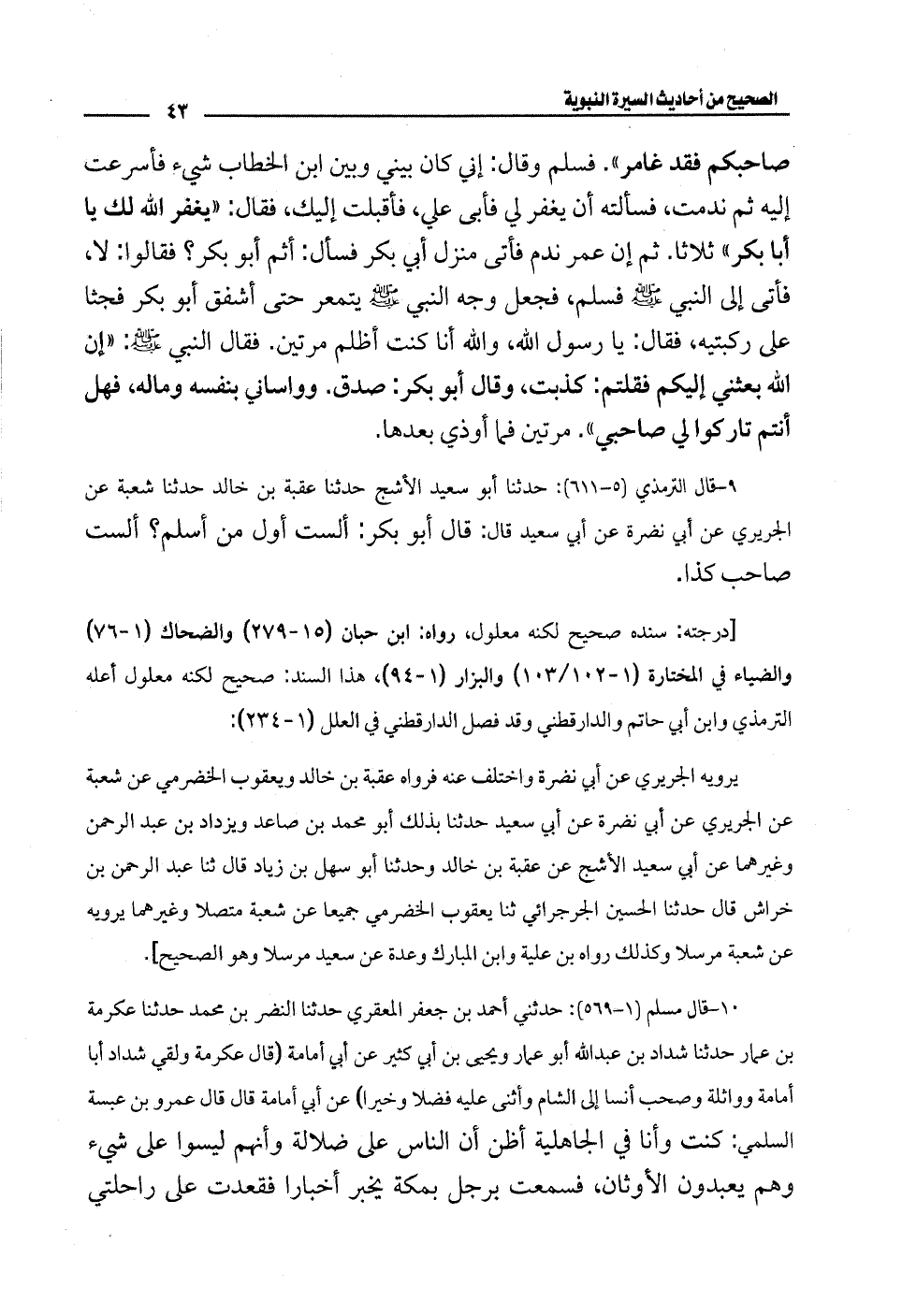 9 - قال الترمذيُّ (5 - 611): حدثنا أبو سعيد الأشج حدثنا عقبة بن خالد حدثنا شعبة عن الجريري عن أبي نضرة عن أبي سعيد قال: قال أبو بكر: ألست أول من أسلم؟ ألست صاحب كذا.