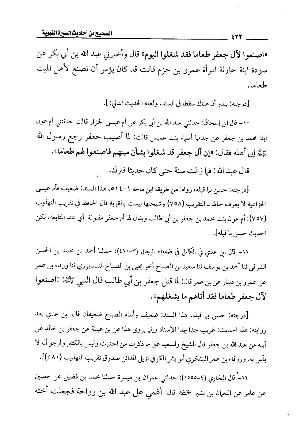 11 - قال ابن عدي في الكامل في ضعفاء الرجال (3 - 410): حدثنا أحمد بن محمَّد بن الحسن الشرقي ثنا أحمد بن يوسف ثنا سعيد بن الصباح أخو يحيى بن الصباح النيسابوري ثنا ورقاء بن عمر عن عمرو بن دينار عن بن عمر قال: لما قتل جعفر بن أبي طالب قال النبي - صلى الله عليه وسلم -: "اصنعوا لآل جعفر طعامًا فقد أتاهم ما يشغلهم".