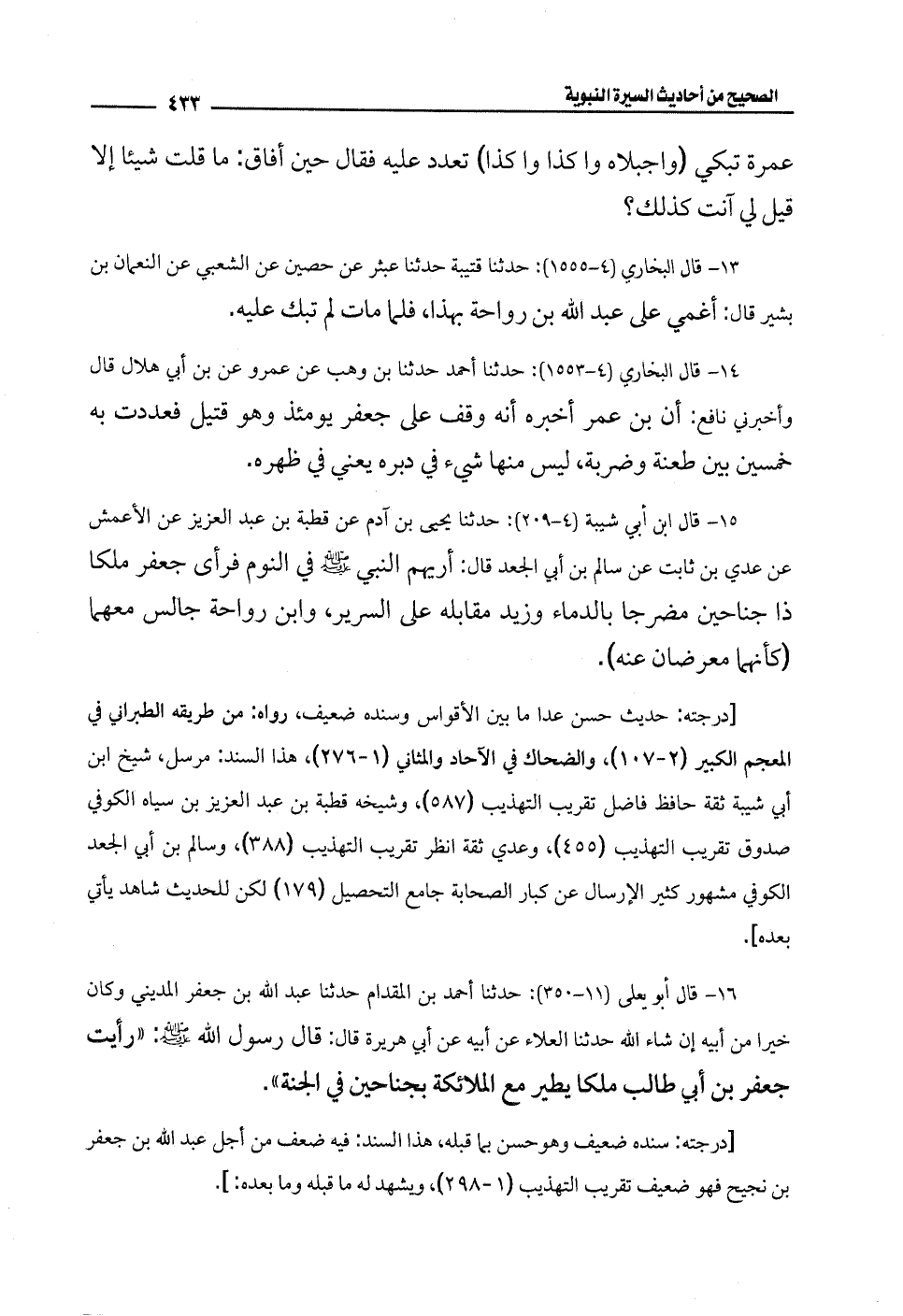 13 - قال البخاري (4 - 1555): حدثنا قتيبة حدثنا عبثر عن حصين عن الشعبي عن النعمان بن بشير قال: أغمي على عبد الله بن رواحة بهذا، فلما مات لم تبك عليه.