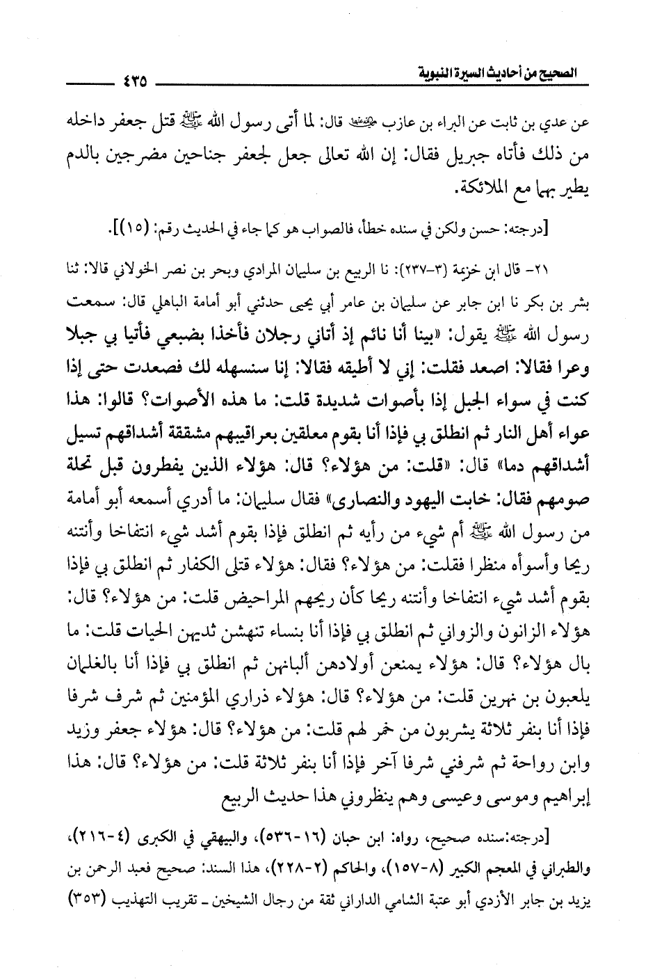 21 - قال ابن خزيمة (3 - 237): نا الربيع بن سليمان المرادي وبحر بن نصر الخولاني قالا: ثنا بشر بن بكر نا ابن جابر عن سليمان بن عامر أبي يحيى حدثني أبو أمامة الباهلي قال: سمعت رسول الله - صلى الله عليه وسلم - يقول: "بينا أنا نائم إذ أتاني رجلان فأخذا بضبعي فأتيا بي جبلا وعرا فقالا: اصعد فقلت: إني لا أطيقه فقالا: إنا سنسهله لك فصعدت حتى إذا كنت في سواء الجبل إذا بأصوات شديدة قلت: ما هذه الأصوات؟ قالوا: هذا عواء أهل النار ثم انطلق بي فإذا أنا بقوم معلقين بعراقيبهم مشققة أشداقهم تسيل أشداقهم دمًا" قال: "قلت من هؤلاء؟ قال: هؤلاء الذين يفطرون قبل تحلة صومهم فقال: خابت اليهود والنصارى" فقال سليمان: ما أدري أسمعه أبو أمامة من رسول الله - صلى الله عليه وسلم - أم شيء من رأيه ثم انطلق فإذا بقوم أشد شيء انتفاخا وأنتنه ريحا وأسوأه منظرا فقلت: من هؤلاء؟ فقال: هؤلاء قتلى الكفار ثم انطلق بي فإذا بقوم أشد شيء انتفاخا وأنتنه ريحا كأن ريحهم المراحيض قلت: من هؤلاء؟ قال: هؤلاء الزانون والزواني ثم انطلق بي فإذا أنا بنساء تنهشن ثديهن الحيات قلت: ما بال هؤلاء؟ قال: هؤلاء يمنعن أولادهن ألبانهن ثم انطلق بي فإذا أنا بالغلمان يلعبون بن نهرين قلت: من هؤلاء؟ قال: هؤلاء ذراري المؤمنين ثم شرف شرفا فإذا أنا بنفر ثلاثة يشربون من خمر لهم قلت: من هؤلاء؟ قال: هؤلاء جعفر وزيد وابن رواحة ثم شرفني شرفًا آخر فإذا أنا بنفر ثلاثة قلت: من هؤلاء؟ قال: هذا إبراهيم وموسى وعيسى وهم ينظروني هذا حديث الربيع.