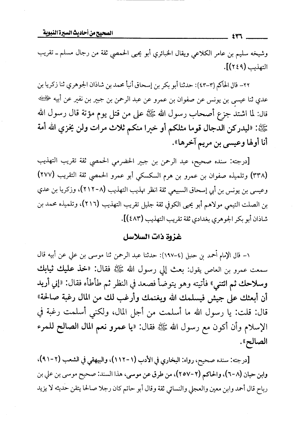 [درجته: سنده صحيح، عبد الرحمن بن جبير الحضرمي الحمصي ثقة تقريب التهذيب (338) وتلميذه صفوان بن عمرو بن هرم السكسكي أبو عمرو الحمصي ثقة التقريب (277) وعيسى بن يونس بن أبي إسحاق السبيعي ثقة انظر تهذيب التهذيب (8 - 212)، وزكريا بن عدي بن الصلت التيمي مولاهم أبو يحيى الكوفي ثقة جليل تقريب التهذيب (216)، وتلميذه محمَّد بن شاذان أبو بكر الجوهري بغدادي ثقة تقريب التهذيب (483)].