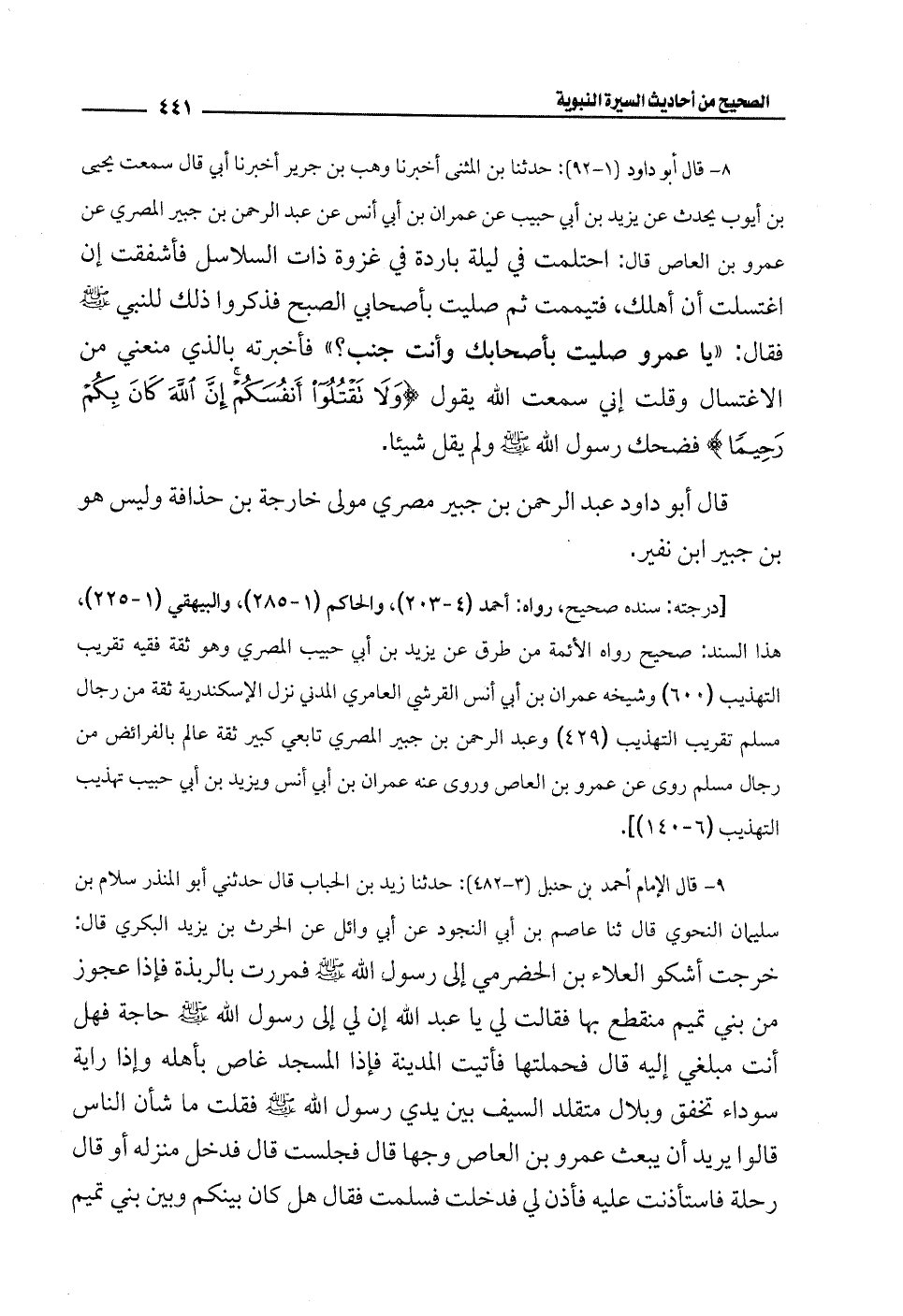 8 - قال أبو داود (1 - 92): حدثنا بن المثنى أخبرنا وهب بن جرير أخبرنا أبي قال سمعت يحيى بن أيوب يحدث عن يزيد بن أبي حبيب عن عمران بن أبي أنس عن عبد الرحمن بن جبير المصري عن عمرو بن العاص قال: احتلمت في ليله باردة في غزوة ذات السلاسل فأشفقت إن اغتسلت أن أهلك، فتيممت ثم صليت بأصحابي الصبح فذكروا ذلك للنبي - صلى الله عليه وسلم - فقال: "يا عمرو صليت بأصحابك وأنت جنب؟ " فأخبرته بالذي منعني من الاغتسال وقلت إني سمعت الله يقول {وَلَا تَقْتُلُوا أَنْفُسَكُمْ إِنَّ اللَّهَ كَانَ بِكُمْ رَحِيمًا} فضحك رسول الله - صلى الله عليه وسلم - ولم يقل شيئا.