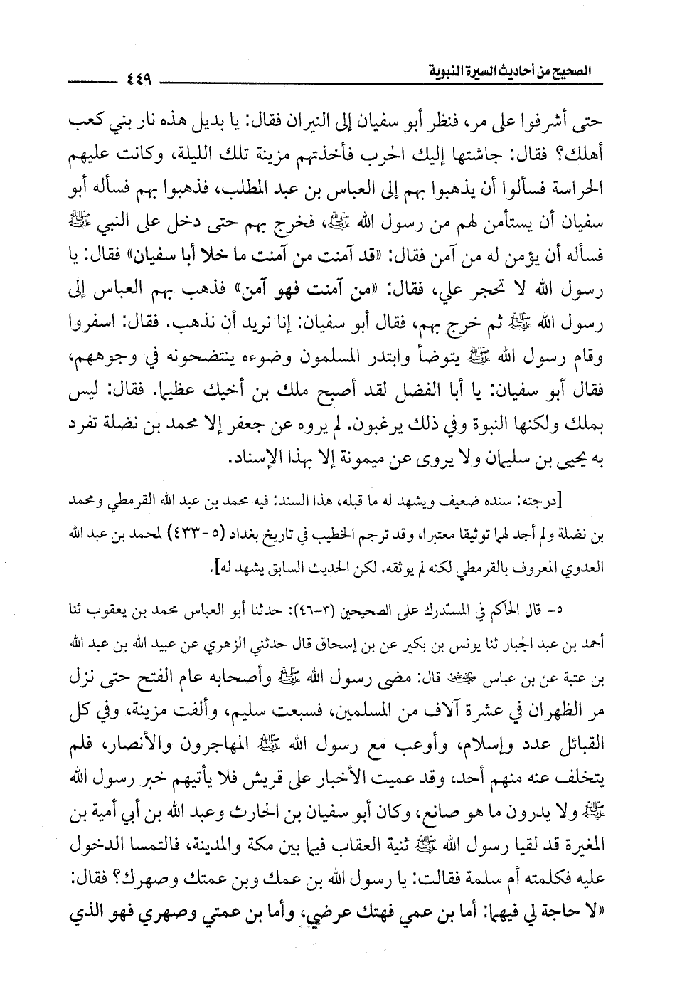 5 - قال الحاكم في المستدرك على الصحيحين (3 - 46): حدثنا أبو العباس محمَّد بن يعقوب ثنا أحمد بن عبد الجبار ثنا يونس بن بكير عن بن إسحاق قال حدثني الزهريّ عن عبيد الله بن عبد الله بن عتبة عن بن عباس -رضي الله عنهما- قال: مضى رسول الله - صلى الله عليه وسلم - وأصحابه عام الفتح حتى نزل مر الظهران وعشرة آلاف من المسلمين، فسبعت سليم، وألفت مزينة، وفي كل القبائل عدد وإسلام، وأوعب مع رسول الله - صلى الله عليه وسلم - المهاجرون والأنصار، فلم يتخلف عنه منهم أحد، وقد عميت الأخبار على قريش فلا يأتيهم خبر رسول الله - صلى الله عليه وسلم - ولا يدرون ما هو صانع، وكان أبو سفيان بن الحارث وعبد الله بن أبي أمية بن المغيرة قد لقيا رسول الله - صلى الله عليه وسلم - ثنية العقاب فيما بين مكة والمدينة، فالتمسا الدخول عليه فكلمته أم سلمة فقالت: يا رسول الله بن عمك وبن عمتك وصهرك؟ فقال: "لا حاجة لي فيهما: أما بن عمي فهتك عرضي، وأما بن عمتي وصهري فهو الذي