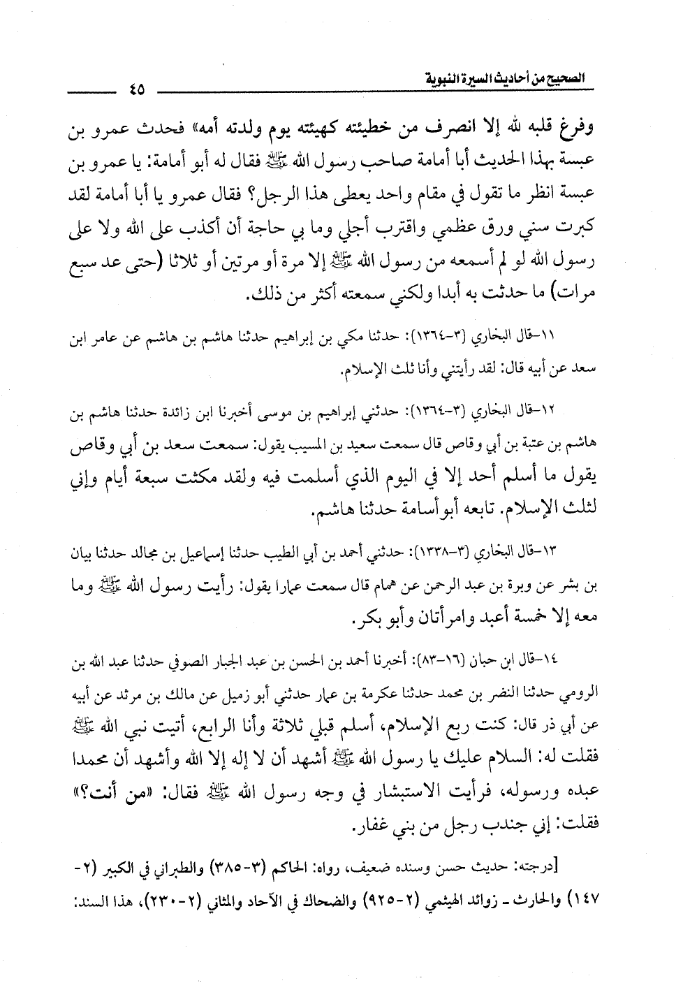 13 - قال البخاري (3 - 1338): حدثني أحمد بن أبي الطيب حدثنا إسماعيل بن مجالد حدثنا بيان بن بشر عن وبرة بن عبد الرحمن عن همام قال سمعت عمارًا يقول: رأيت رسول الله - صلى الله عليه وسلم - وما معه إلا خمسة أعبد وامرأتان وأبو بكر.