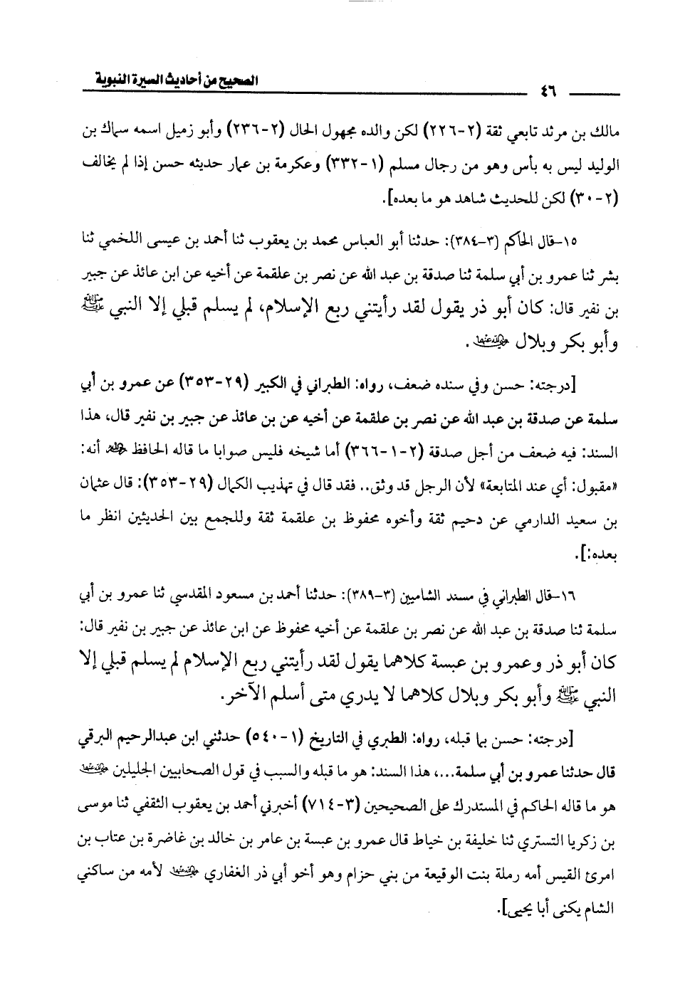 [درجته: حسن بما قبله، رواه: الطبري في التاريخ (1 - 540) حدثني بن عبد الرحيم البرقي قال حدثنا عمرو بن أبي سلمة ... ، هذا السند: هو ما قبله والسبب في قول الصحابيين الجليلين -رضي الله عنهما - هو ما قاله الحاكم في المستدرك على الصحيحين (3 - 714) أخبرني أحمد بن يعقوب الثقفي ثنا موسى بن زكريا التستري ثنا خليفة بن خياط قال عمرو بن عبسة بن عامر بن خالد بن غاضرة بن عتاب بن امرئ القيس أمه رملة بنت الوقيعة من بني حزام وهو أخو أبي ذر الغفاري -رضي الله عنها - لأمه من ساكني الشام يكنى أبا يحيي].